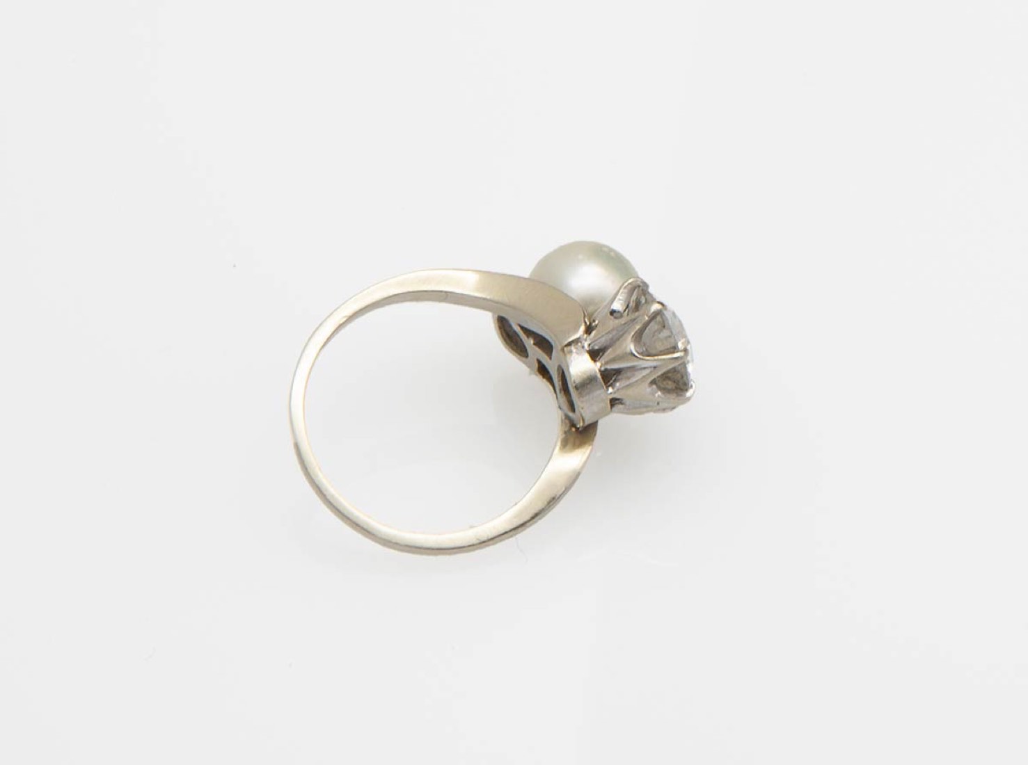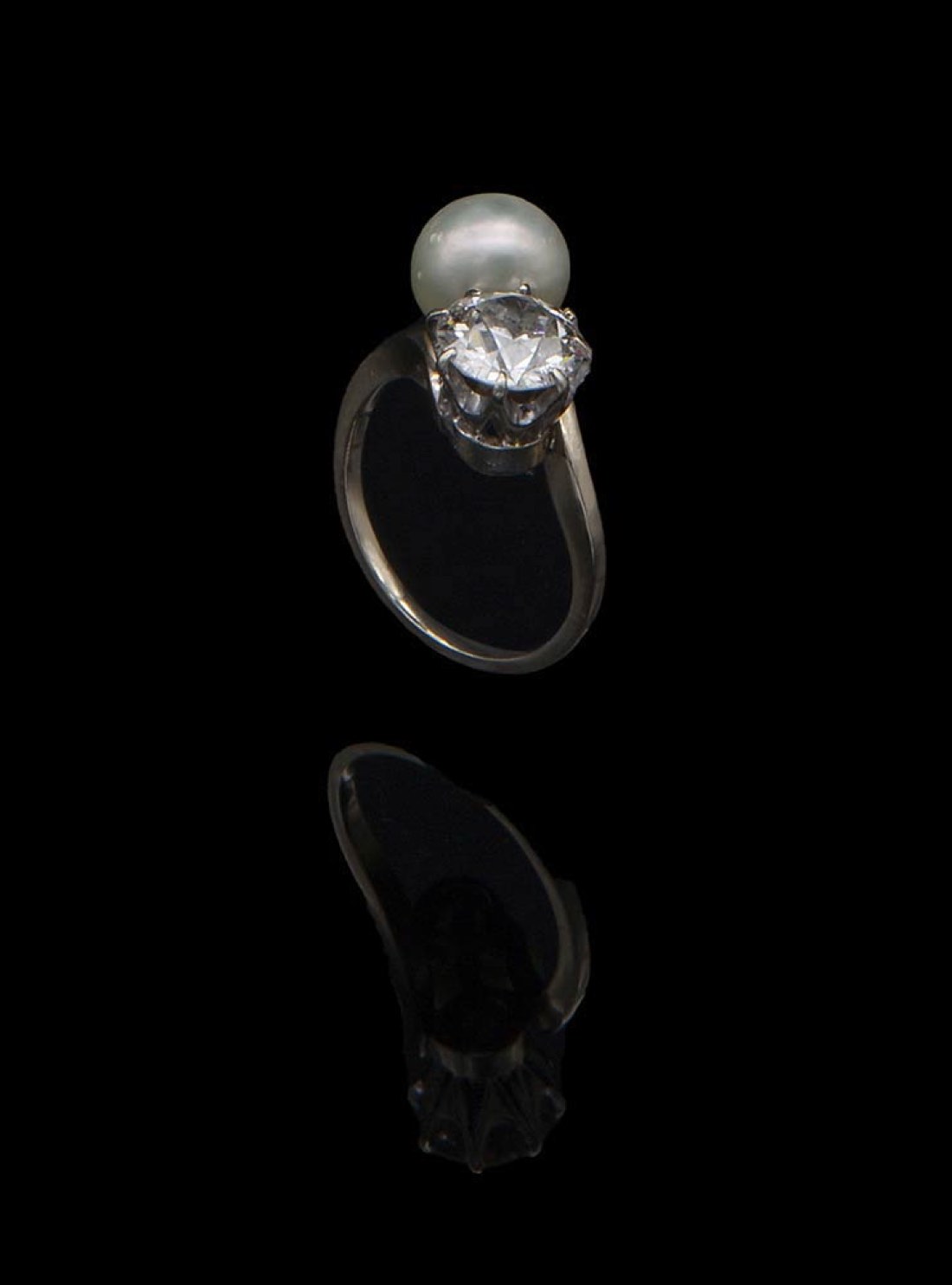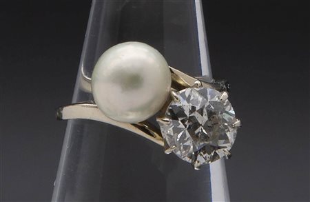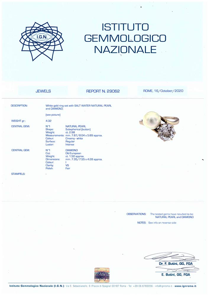 in oro bianco 18k, modello contraré con "perla naturale d'acqua salata" e diamante taglio vecchio europeo. Diametro perla 8 mm. Diamante 1,50 ct ca. Misura IT 8 - US 4,5. Peso 4,3 gr. Il lotto è accompagnato da perizia tecnica Istituto Gemmologico Nazionale I.G.N. Stato di conservazione: ***** eccellente.