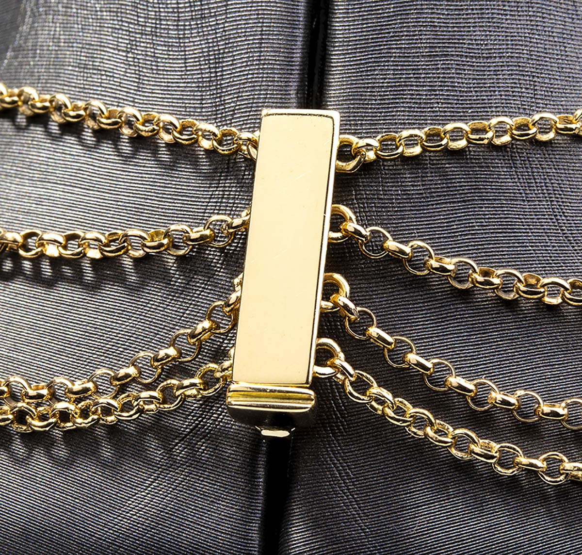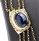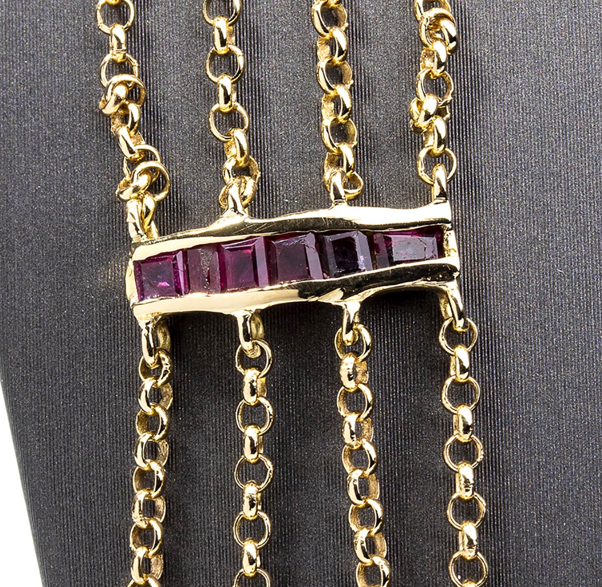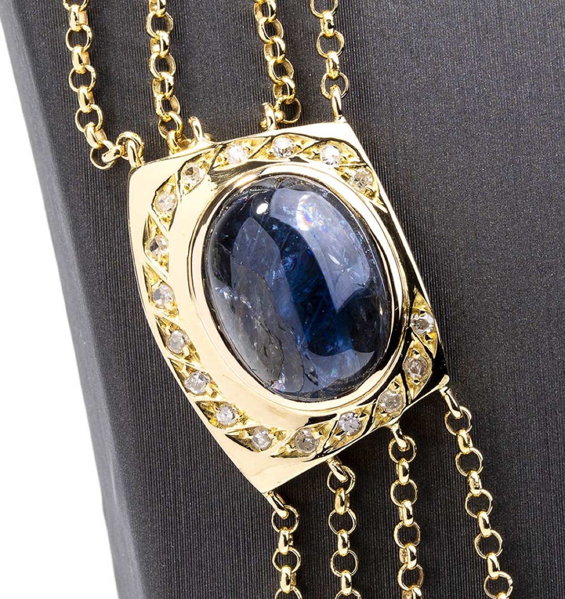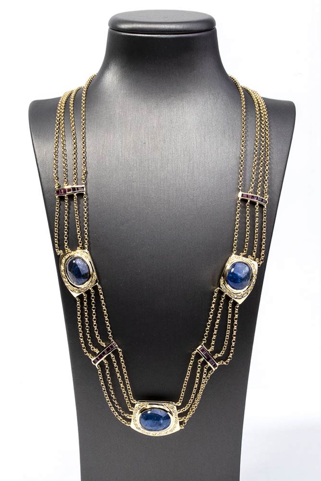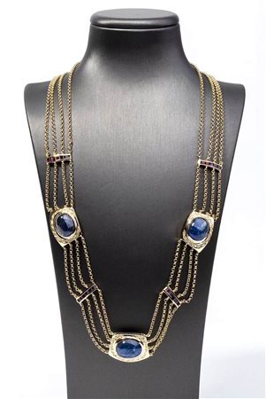 oro giallo 18k, con zaffiri taglio cabochon per complessivi 27,00 ct circa, rubini taglio carré 0,65 ct circa e diamanti taglio huit-huit 0,65 ct circa. Lunghezza 52 cm, larghezza 20 mm. Peso 50 gr. Stato di conservazione: ***** eccellente.