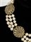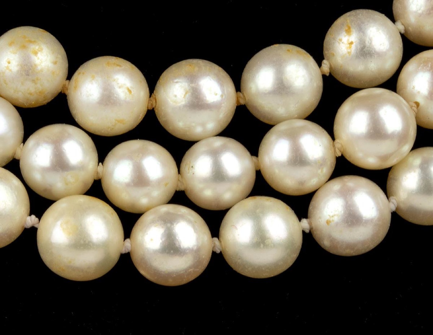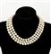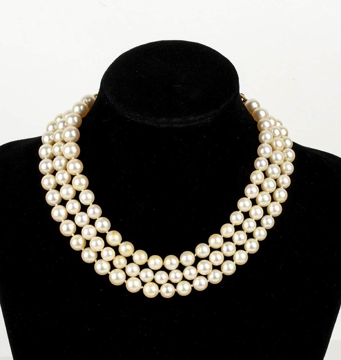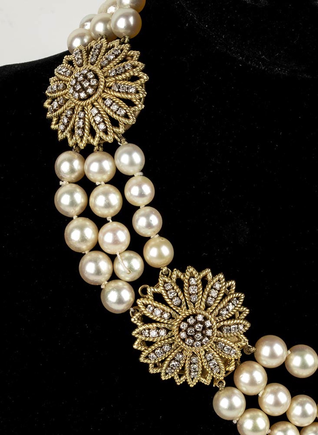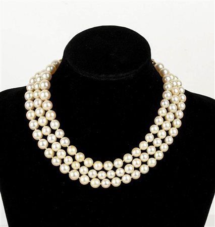 a 3 fili di perle coltivate d'acqua salata, diametro 10 - 8 mm e doppia fermezza in oro giallo 18k con diamanti taglio brillante 2,75 ct circa, G-H, VVS-VS. Diametro fermezze 35 mm. Lunghezza 38 cm. Punzonata "750" e "670 NA". Peso 139 gr. Stato di conservazione: **** buono.