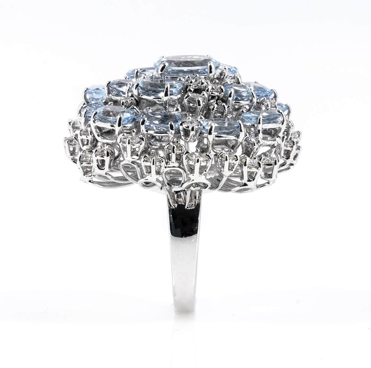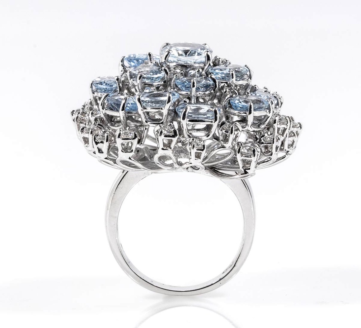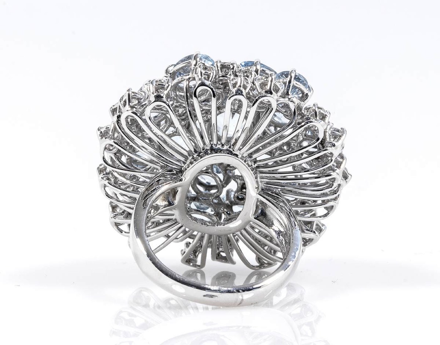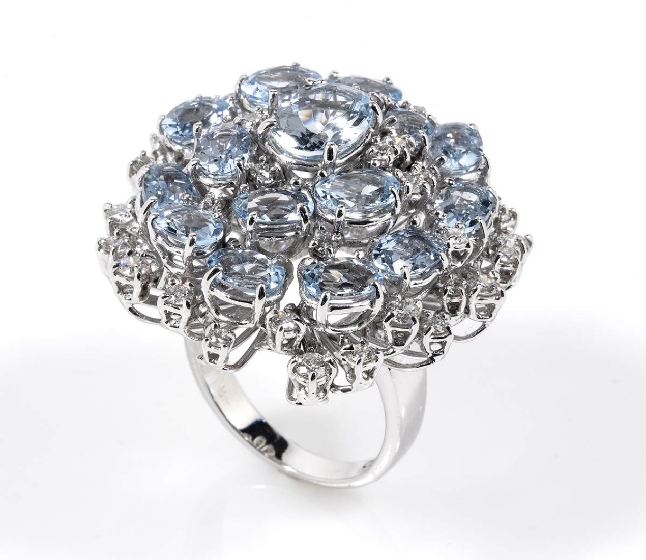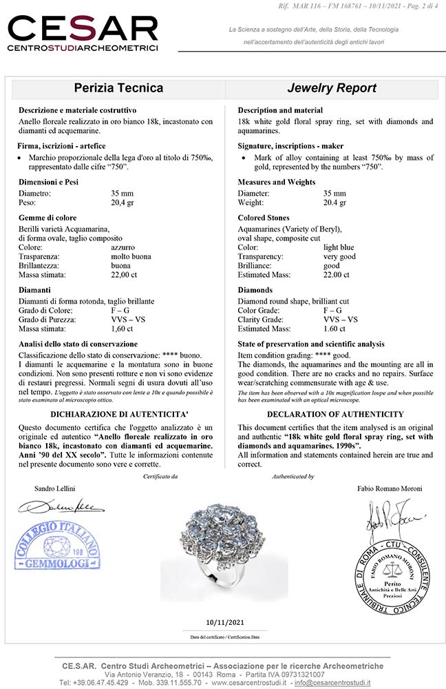oro bianco 18k, incastonato con diamanti taglio brillante 1,60 ct circa, F-G, VVS-VS ed acquemarine ovali 22,00 ct circa. Misura IT 14 - misura US 6,5. Punzonato "750" e "1217 NA". Peso 20,3 gr. Stato di conservazione: ***** eccellente. Accompagnato da certificato di verifica gemmologica Ce.S.Ar. Centro Studi Archeometrici.