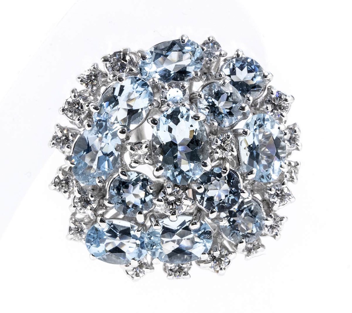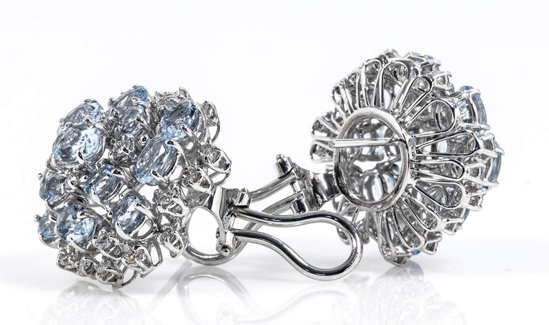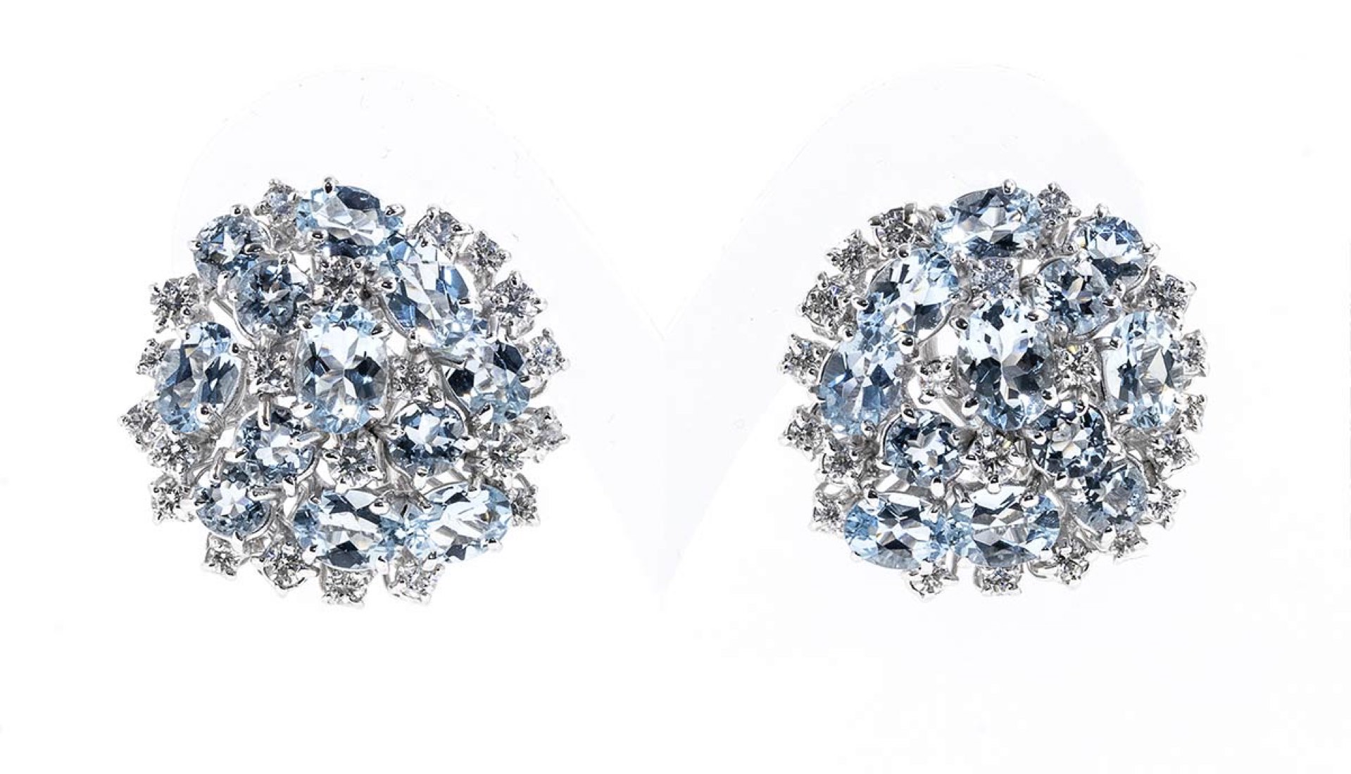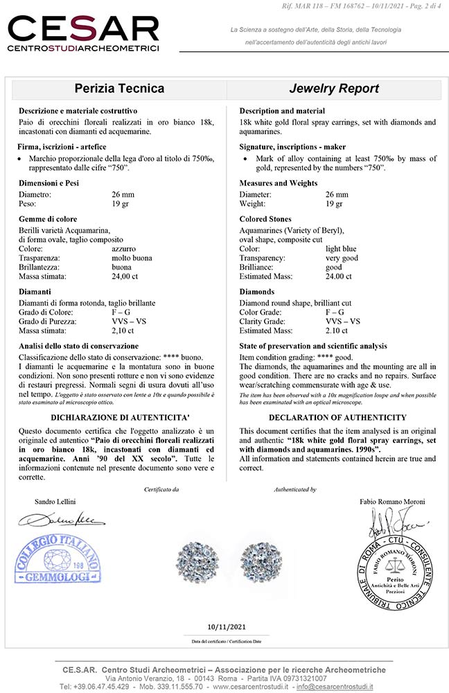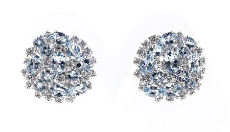 oro bianco 18k, incastonati con diamanti taglio brillante 2,10 ct circa, F-G, VVS-VS ed acquemarine 24,00 ct circa. Punzoni "750" e "1217 NA". Peso 19 gr. Stato di conservazione: ***** eccellente. Accompagnato da certificato di verifica gemmologica Ce.S.Ar. Centro Studi Archeometrici.