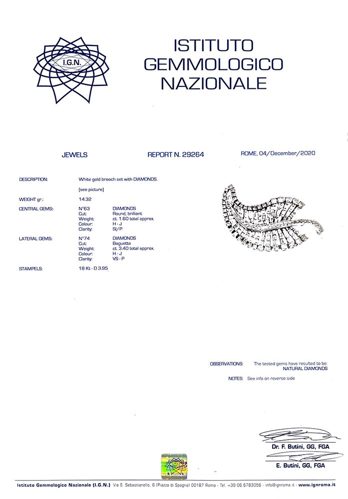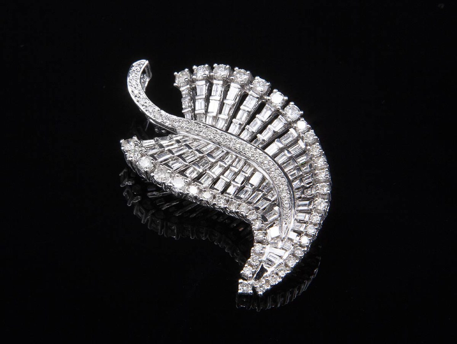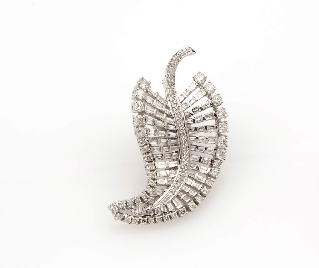 in oro bianco 18k, con diamanti taglio brillante e taglio baguette 5,00 ct ca., H-J, VS-SI. Dimensioni 47 x 26 mm. Punzonato "18 kt" e "D395". Peso 14,3 gr. Stato di conservazione: ***** eccellente.