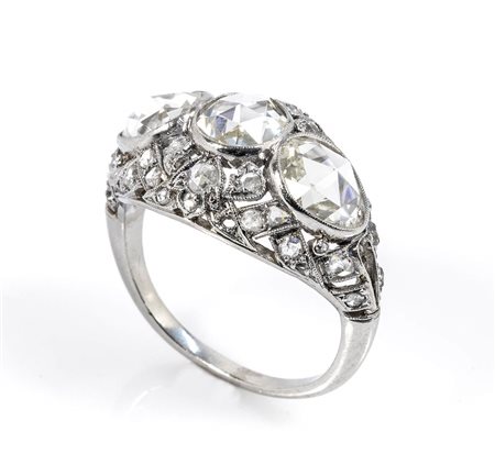 platinio 950/100, realizzato a mano in Italia finemente traforato e decorato. Gioiello déco impreziosito da diamanti taglio a rosa 2,00 ct circa. Dimensioni fronte 22,5 x 14 mm. Misura IT 16 - Misura US 7,5. Peso 8,5 gr. Stato di conservazione: ***** eccellente. Accompagnato da certificato di verifica gemmologica Ce.S.Ar. Centro Studi Archeometrici.