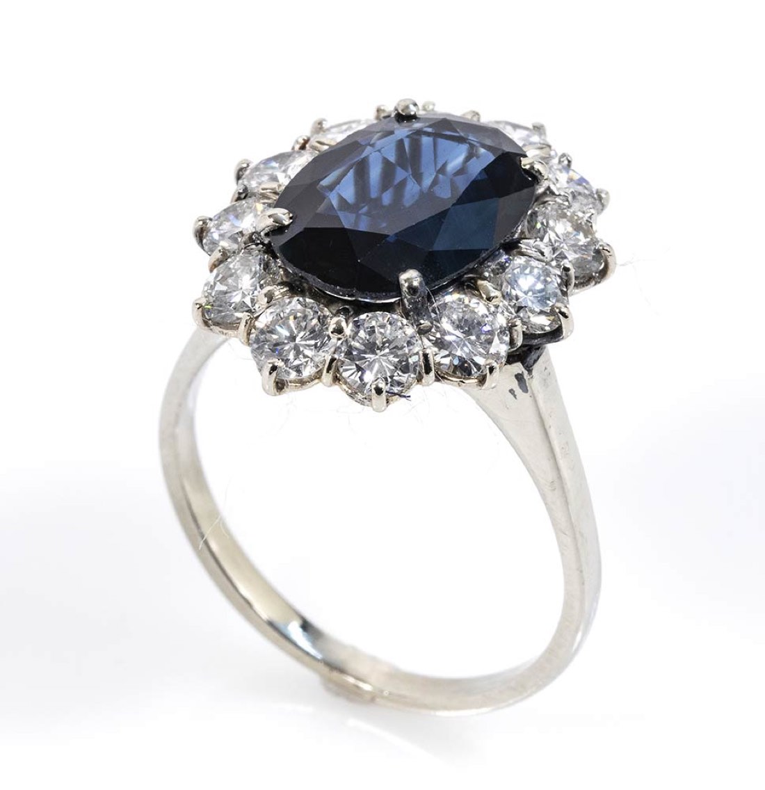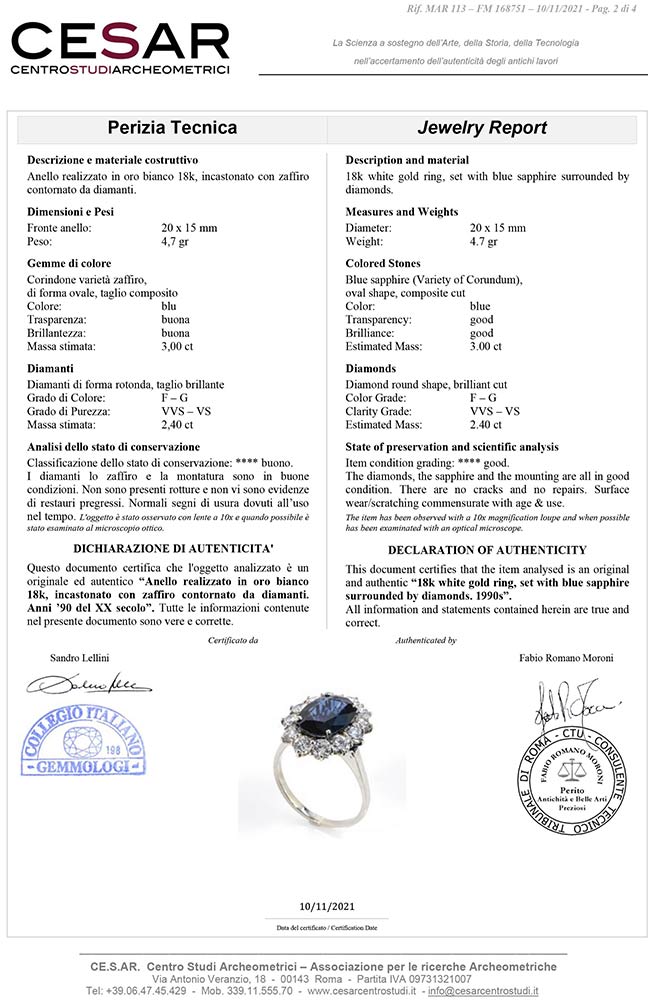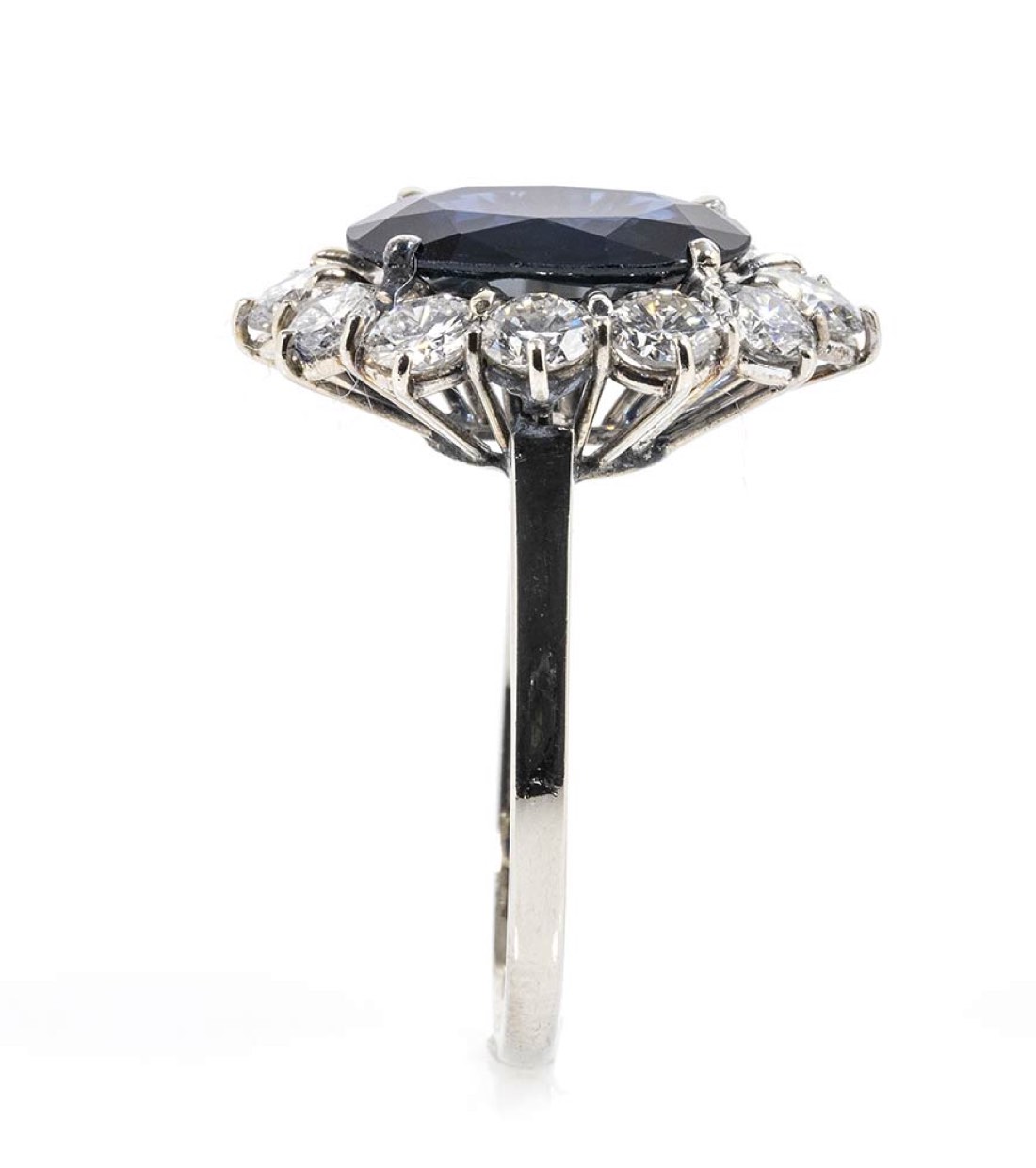 oro bianco 18k, incastonato con zaffiro 3,00 ct circa, contornato da diamanti taglio brillante 2,40 ct circa, F-G, VVS-VS. Dimensioni fronte 20 x 15 mm. Misura IT 14 - Misura US 6. Peso 4,7 gr. Stato di conservazione: ***** eccellente. Accompagnato da certificato di verifica gemmologica Ce.S.Ar. Centro Studi Archeometrici.