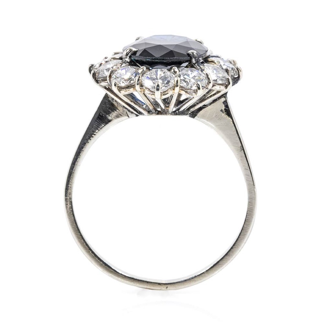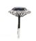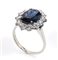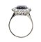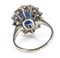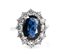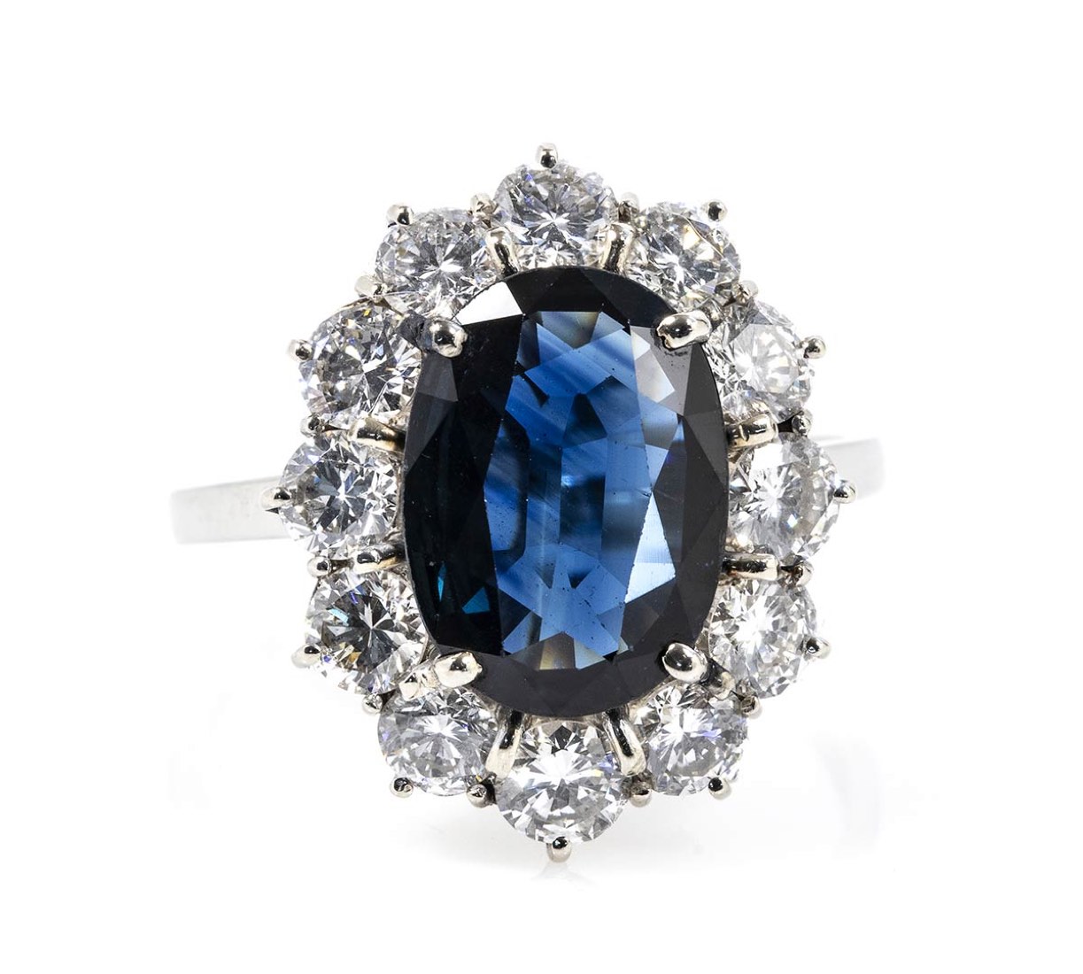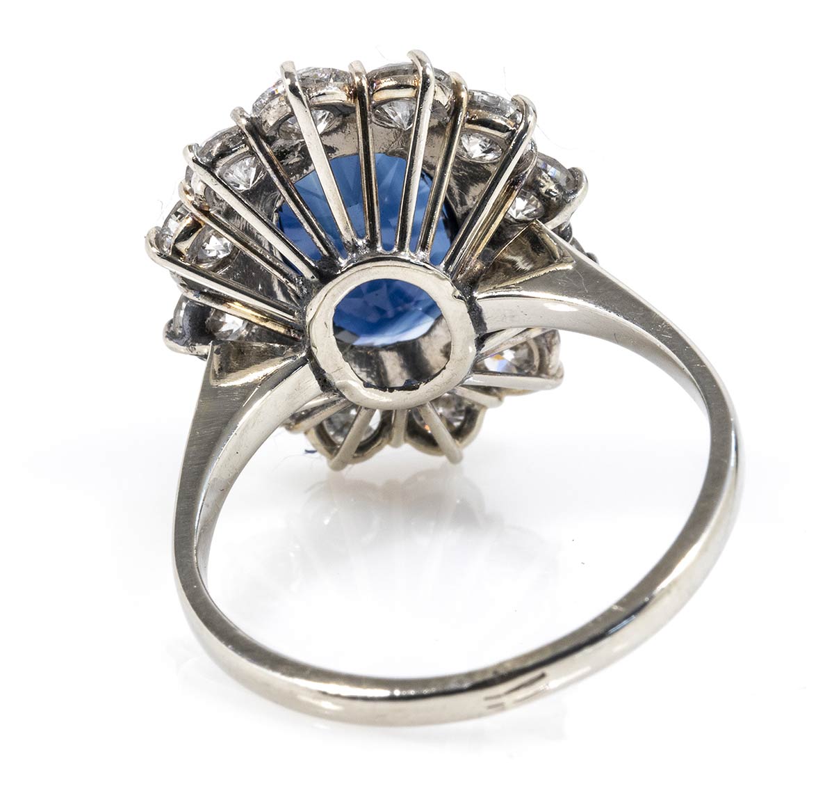 oro bianco 18k, incastonato con zaffiro 3,00 ct circa, contornato da diamanti taglio brillante 2,40 ct circa, F-G, VVS-VS. Dimensioni fronte 20 x 15 mm. Misura IT 14 - Misura US 6. Peso 4,7 gr. Stato di conservazione: ***** eccellente. Accompagnato da certificato di verifica gemmologica Ce.S.Ar. Centro Studi Archeometrici.