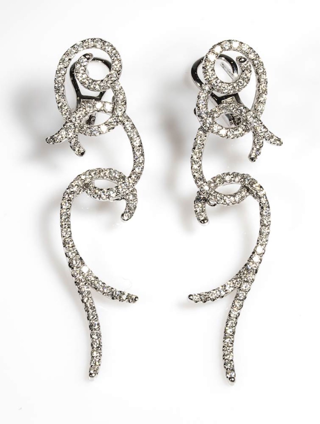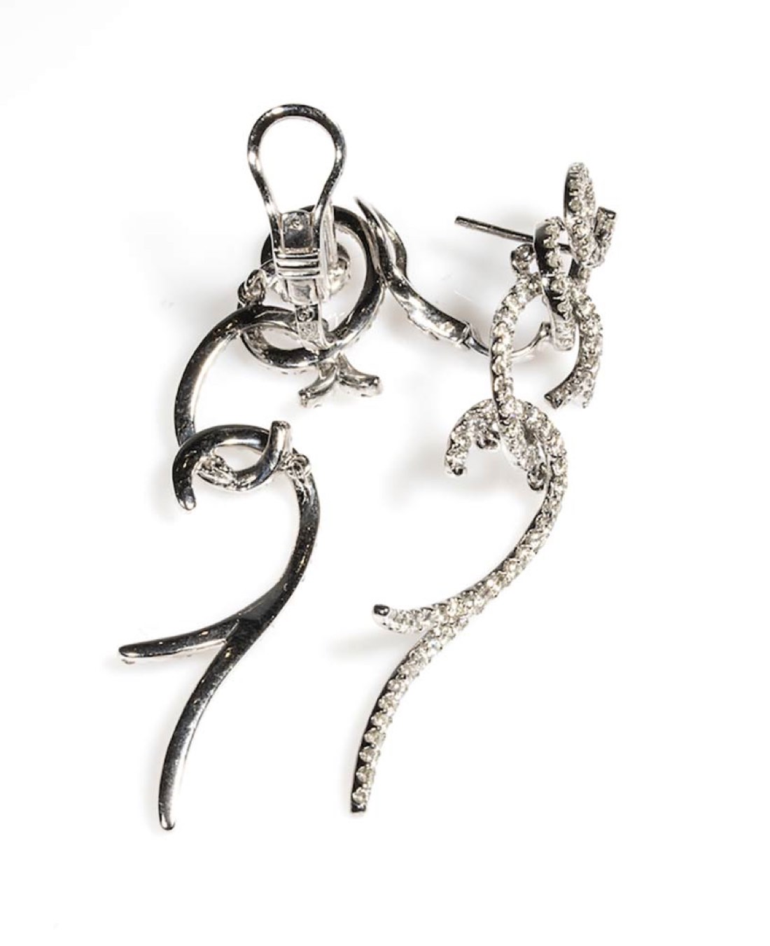 in oro bianco 18k, con motivo a volute di sottili nastri in diamanti taglio brillante 2,40 ct circa, G-H, VVS-SI. Punzonati "750" e "18K". Dimensioni 60 x 15 mm. Peso 13 gr. Stato di conservazione: ***** eccellente.