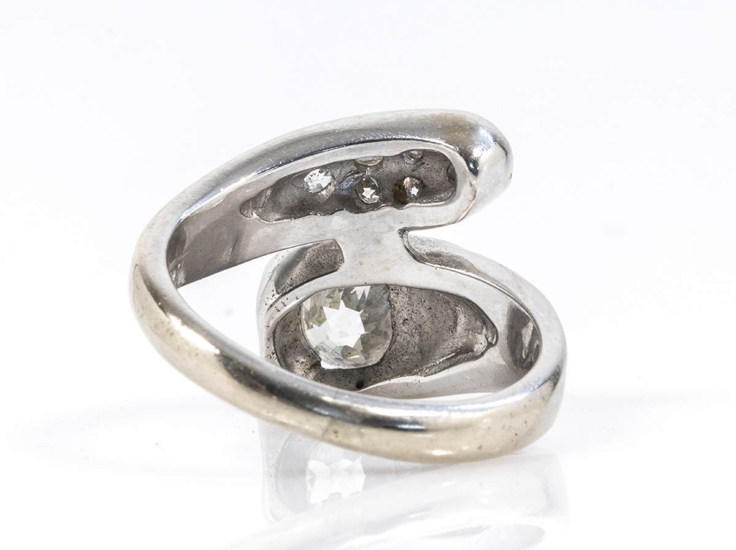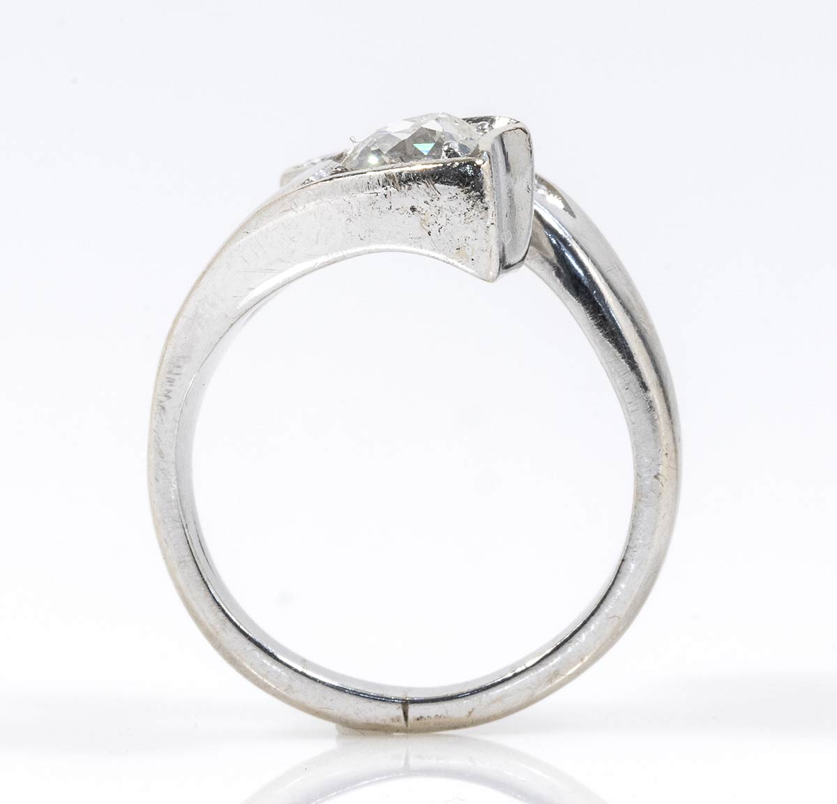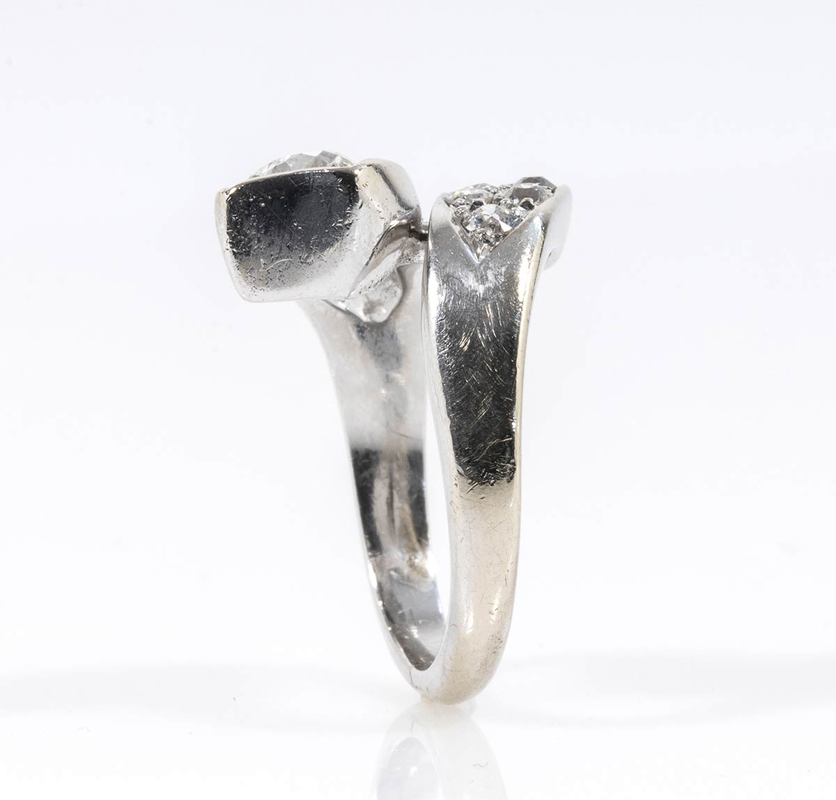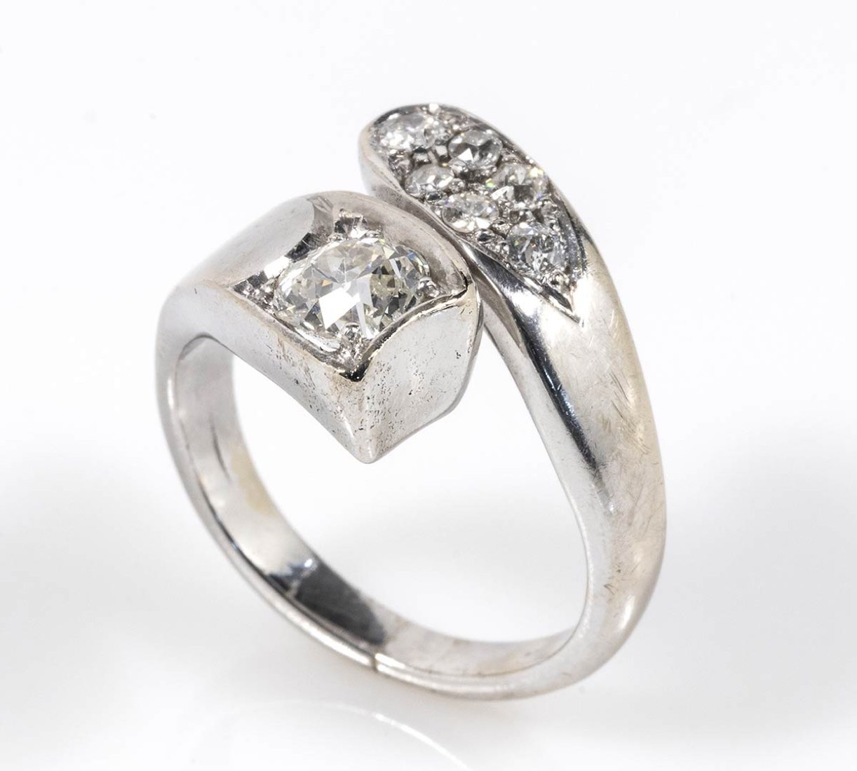 oro bianco 18k, con diamante centrale di taglio vecchio europeo vecchio 0,70 ct circa, diamanti laterali 0,25 ct circa. Dimensioni fronte 20 x 15 mm. Misura IT 13 - Misura US 6,5. Peso 8,1 gr. Stato di conservazione: ***** eccellente.