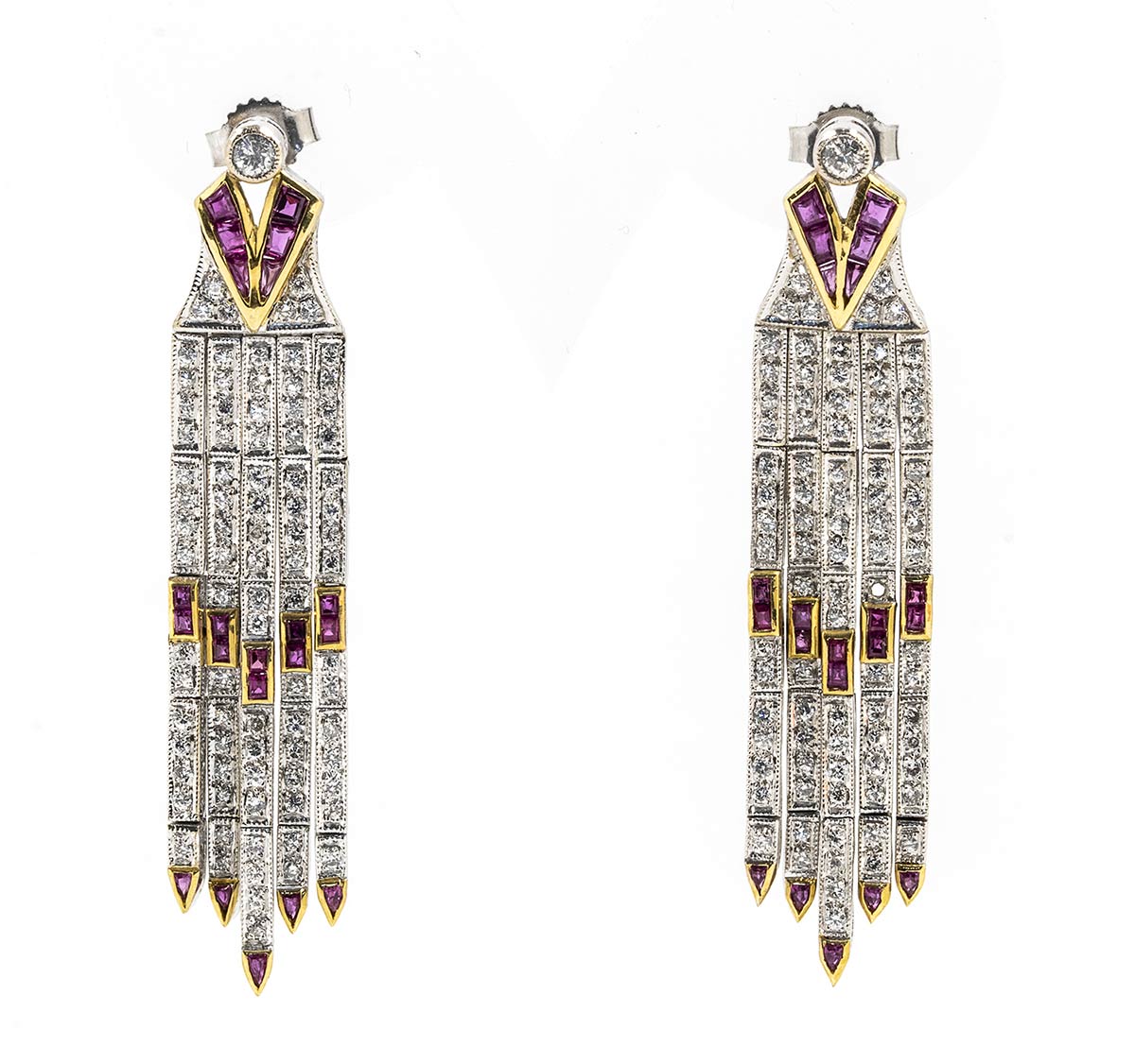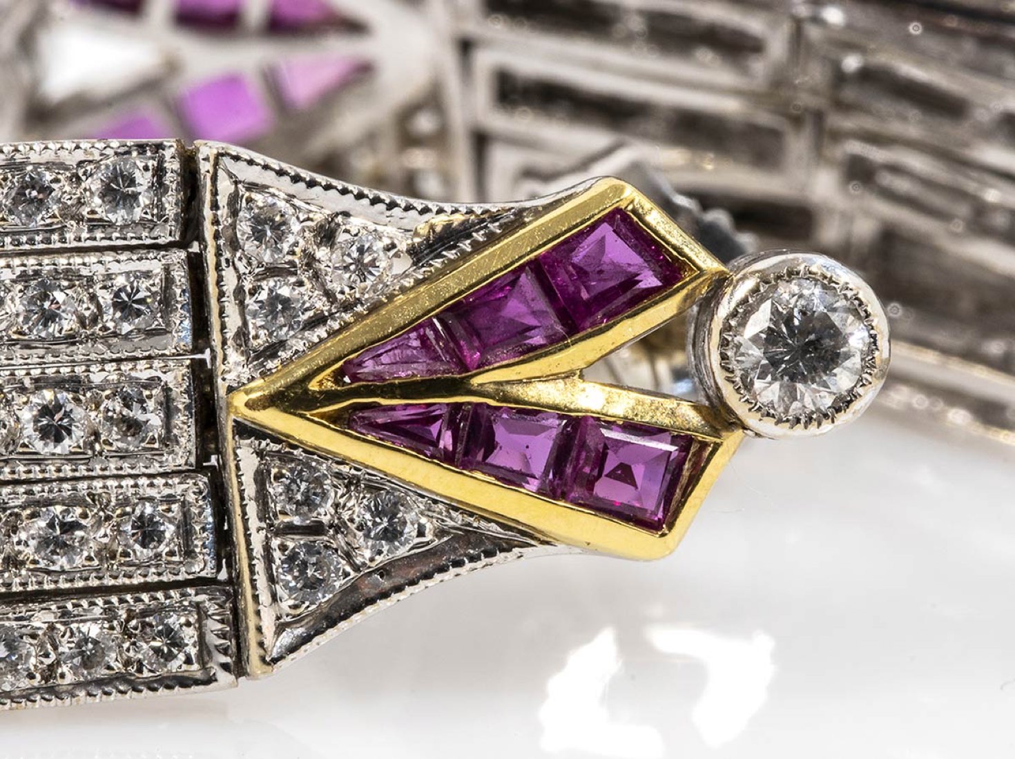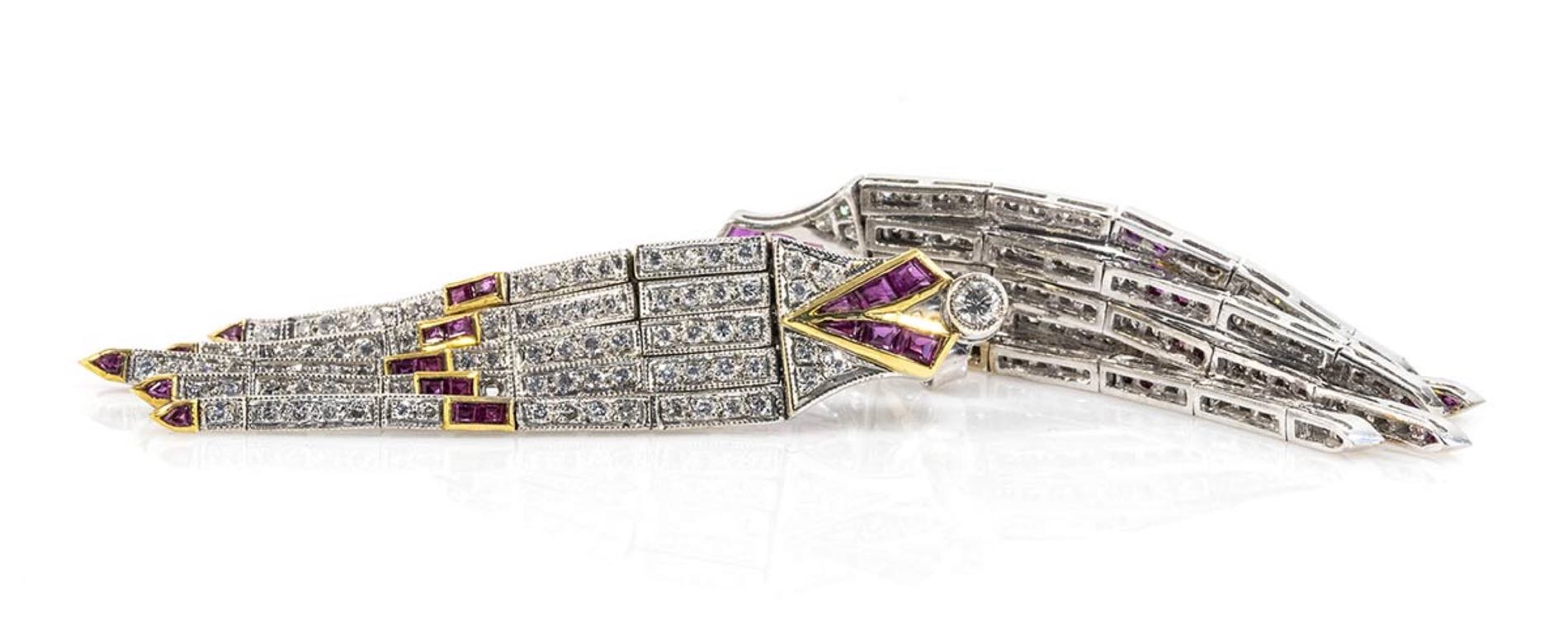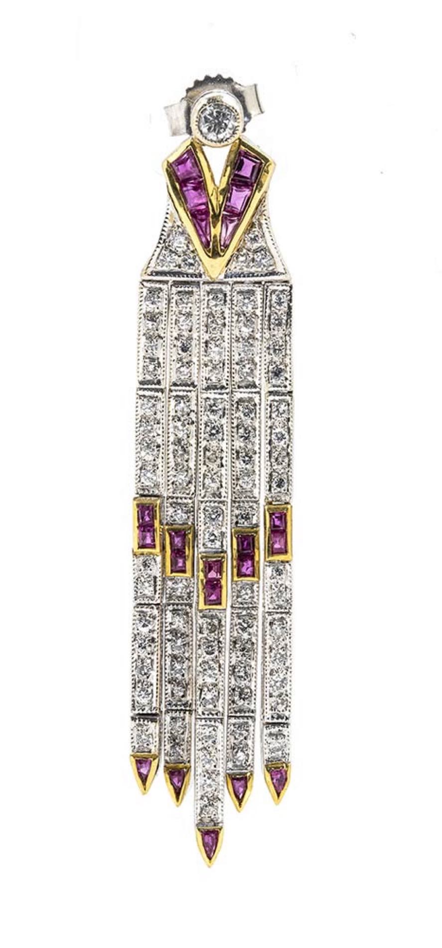 in oro giallo e bianco 18k, con disegno di frangia in motivo a diamanti e rubini. Diamanti taglio brillante 1,40 ct circa, G-H, VVS/VS. Rubini taglio carré 0,75 ct circa. Dimensioni 50 x 10 mm. Peso 16,6 gr. Stato di conservazione: ***** eccellente.