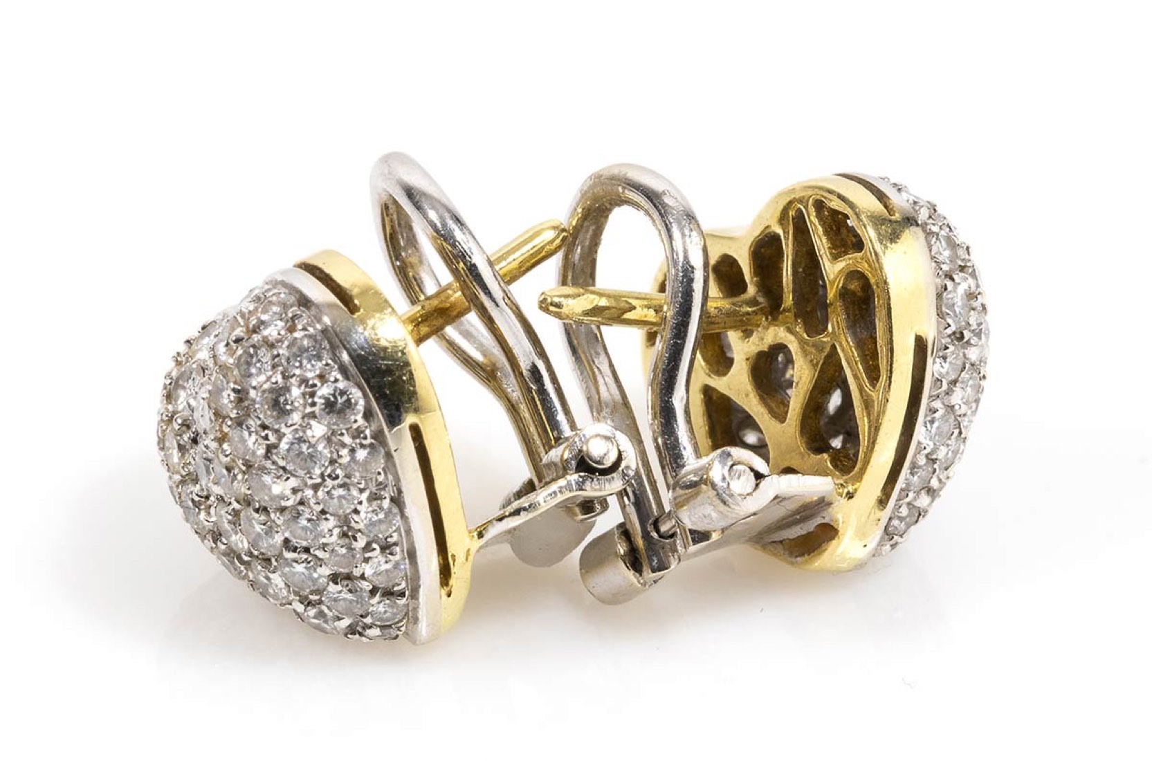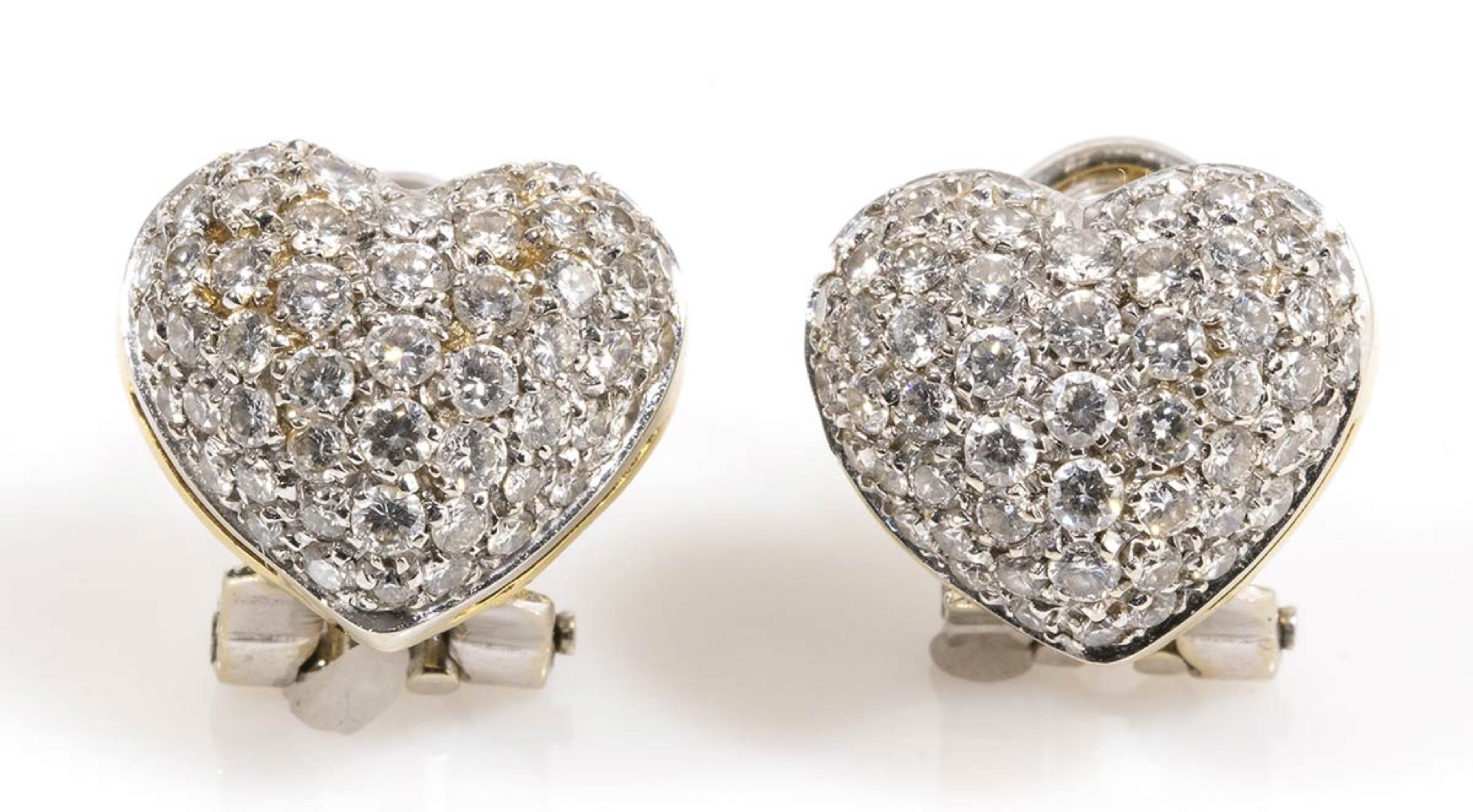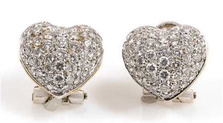 oro giallo e bianco 18k, a forma di cuore, incastonati con pavé di diamanti taglio brillante 2,45 ct circa, G-H, VVS-VS. Dimensioni fronte 15 x 15 mm. Punzonati "750" e "2115 VI". Peso 8,4 gr. Stato di conservazione: ***** eccellente.