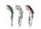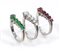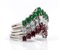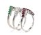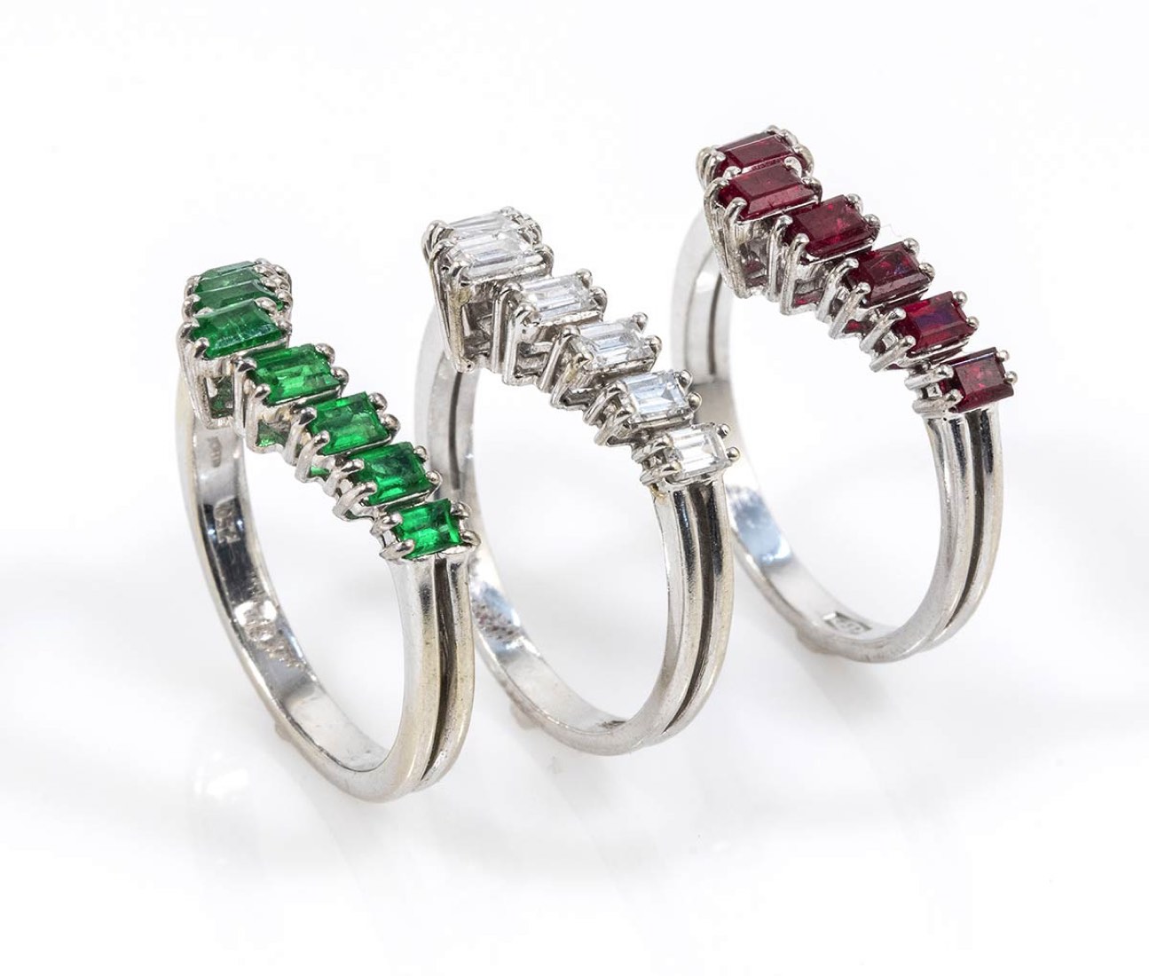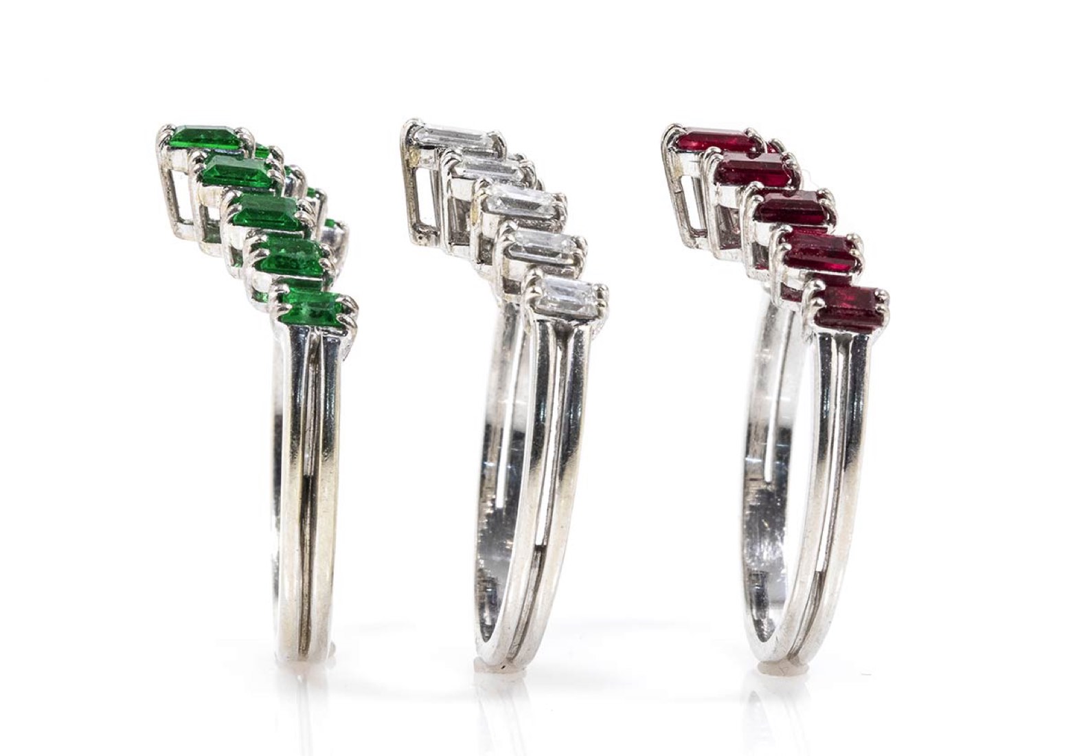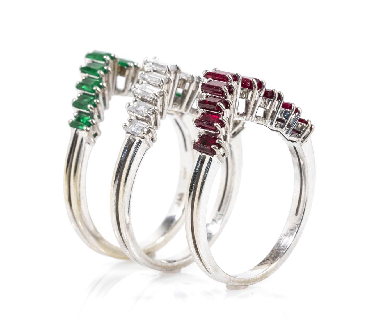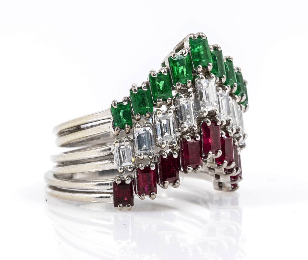 oro bianco 18k, incastonati rispettivamente con diamanti, rubini e smeraldi taglio baguette. Diamanti 0,90 ct circa, G, VVS. Smeraldi 0,80 ct circa. Rubini 1,00 ct circa. Dimensioni fronte 19 x 8,5 mm. Misura IT 11 - Misura US 5,5. Peso totale 8,2 gr. Stato di conservazione: ***** eccellente.