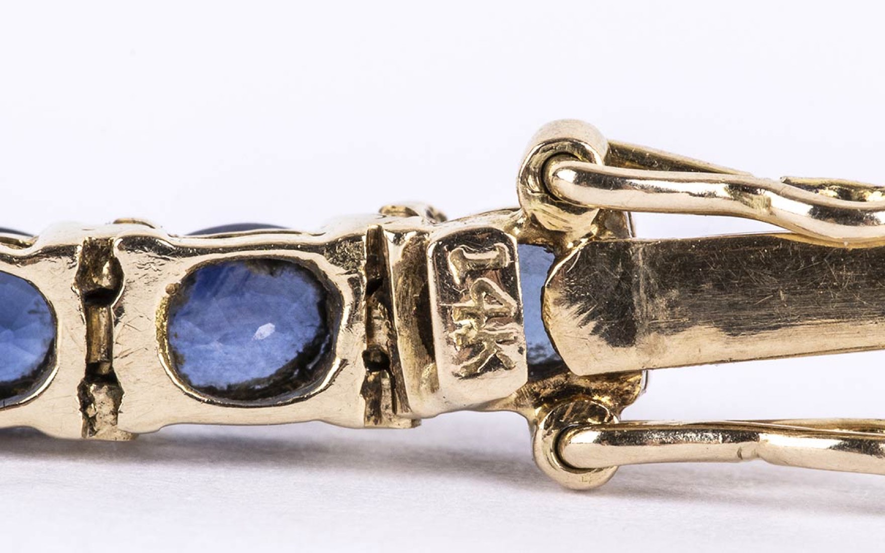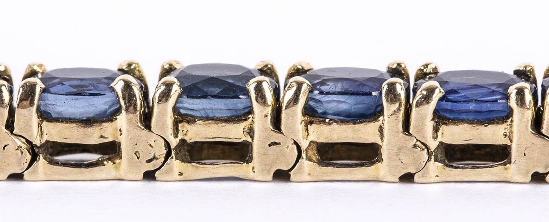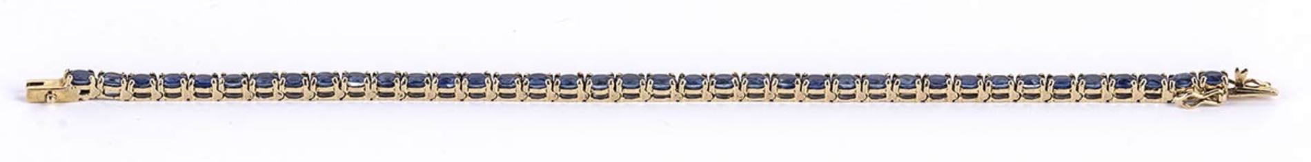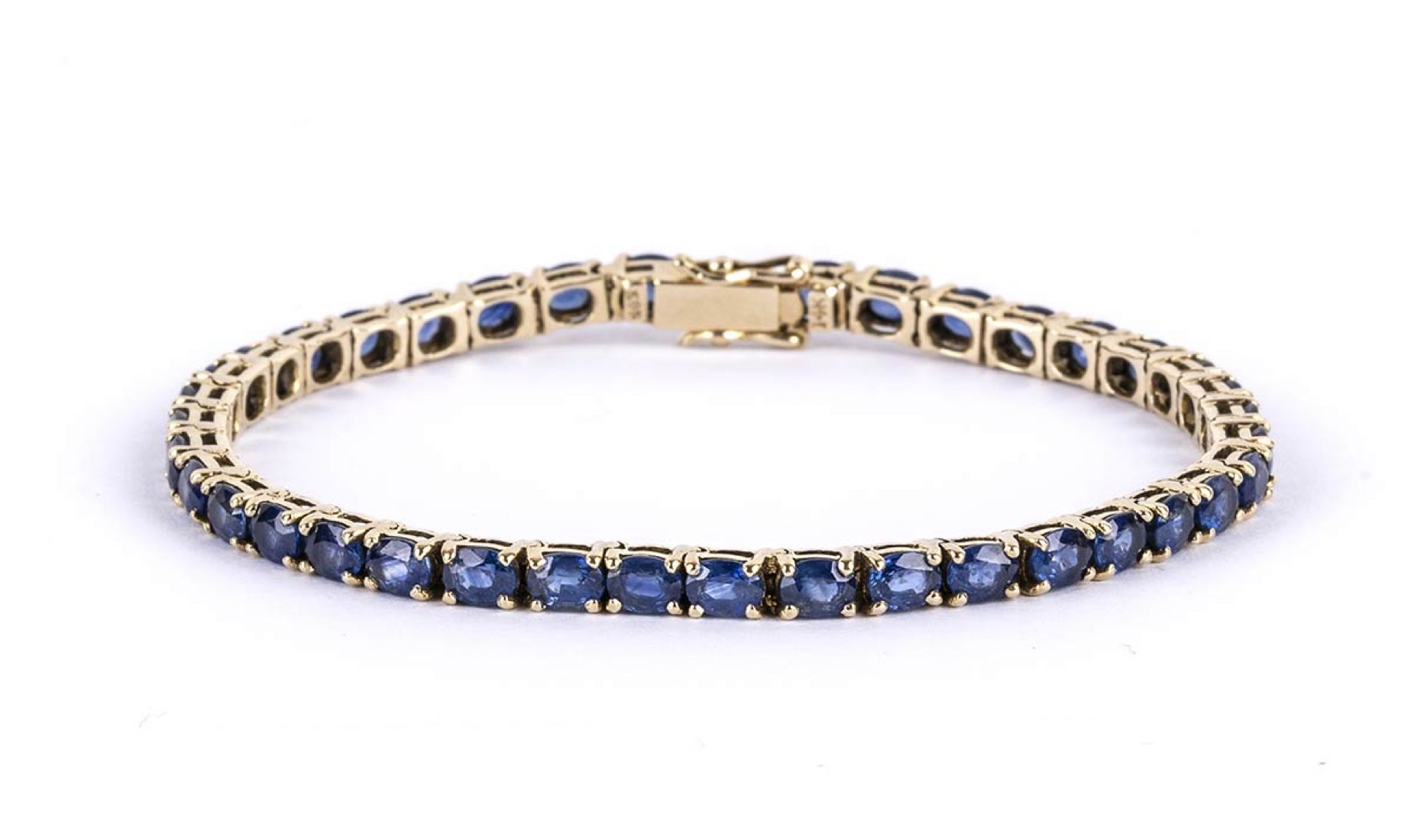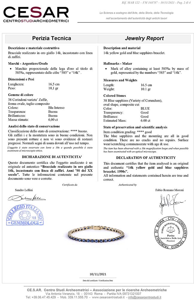 oro giallo 14k, incastonato con linea di zaffiri 6,00 ct circa. Lunghezza 16,5 cm Peso 10,1 gr. Punzonati "14 K" e "585". Stato di conservazione: ***** eccellente. Accompagnato da certificato di verifica gemmologica Ce.S.Ar. Centro Studi Archeometrici.