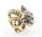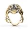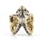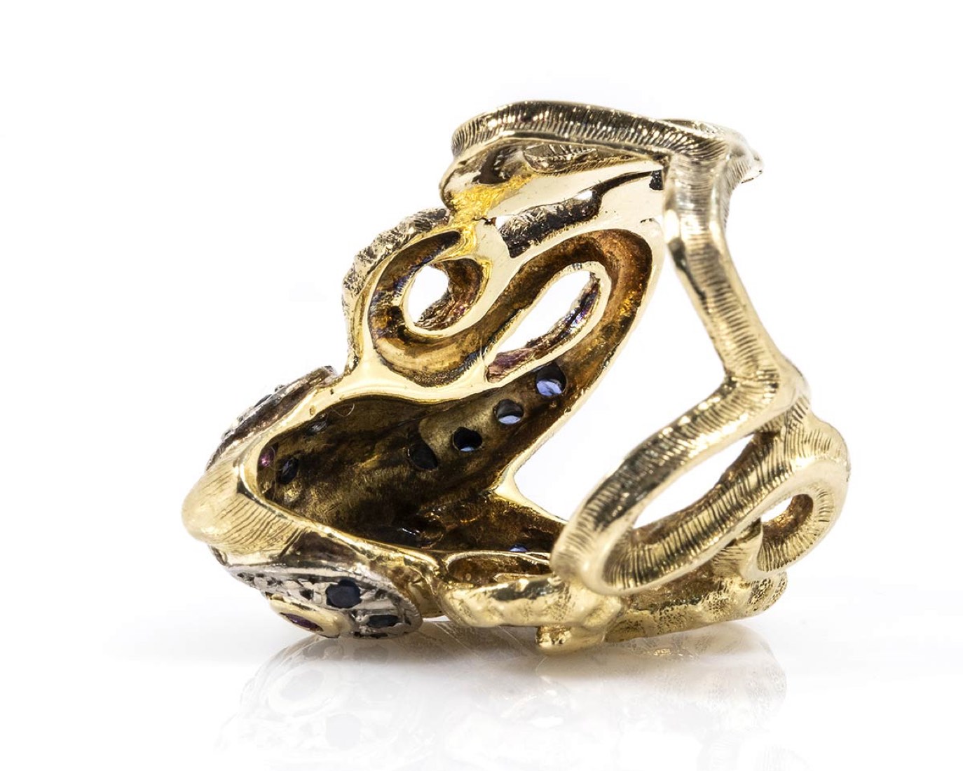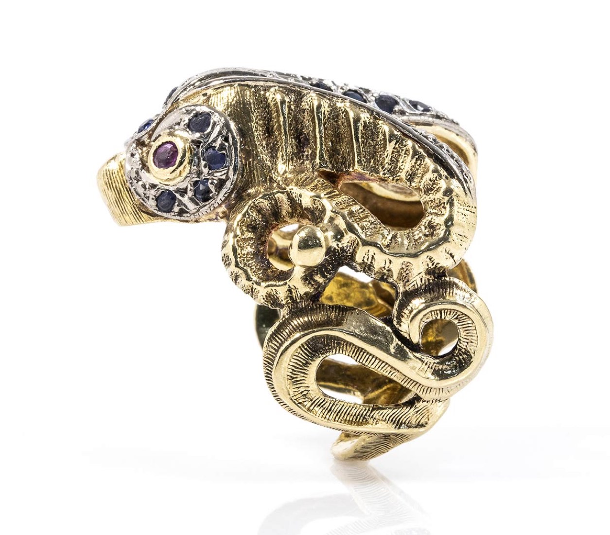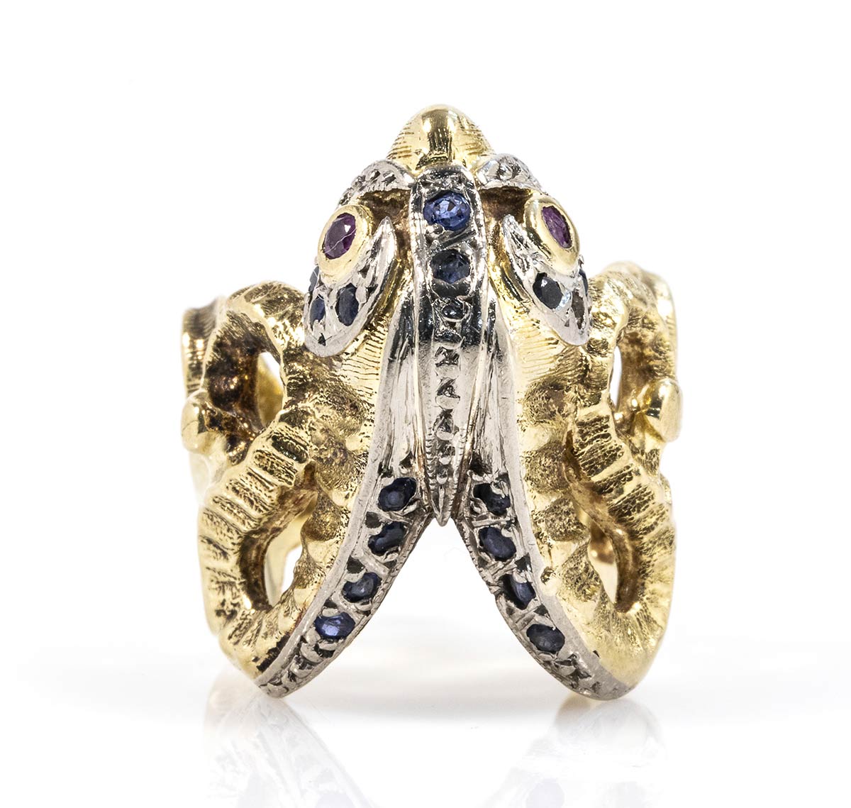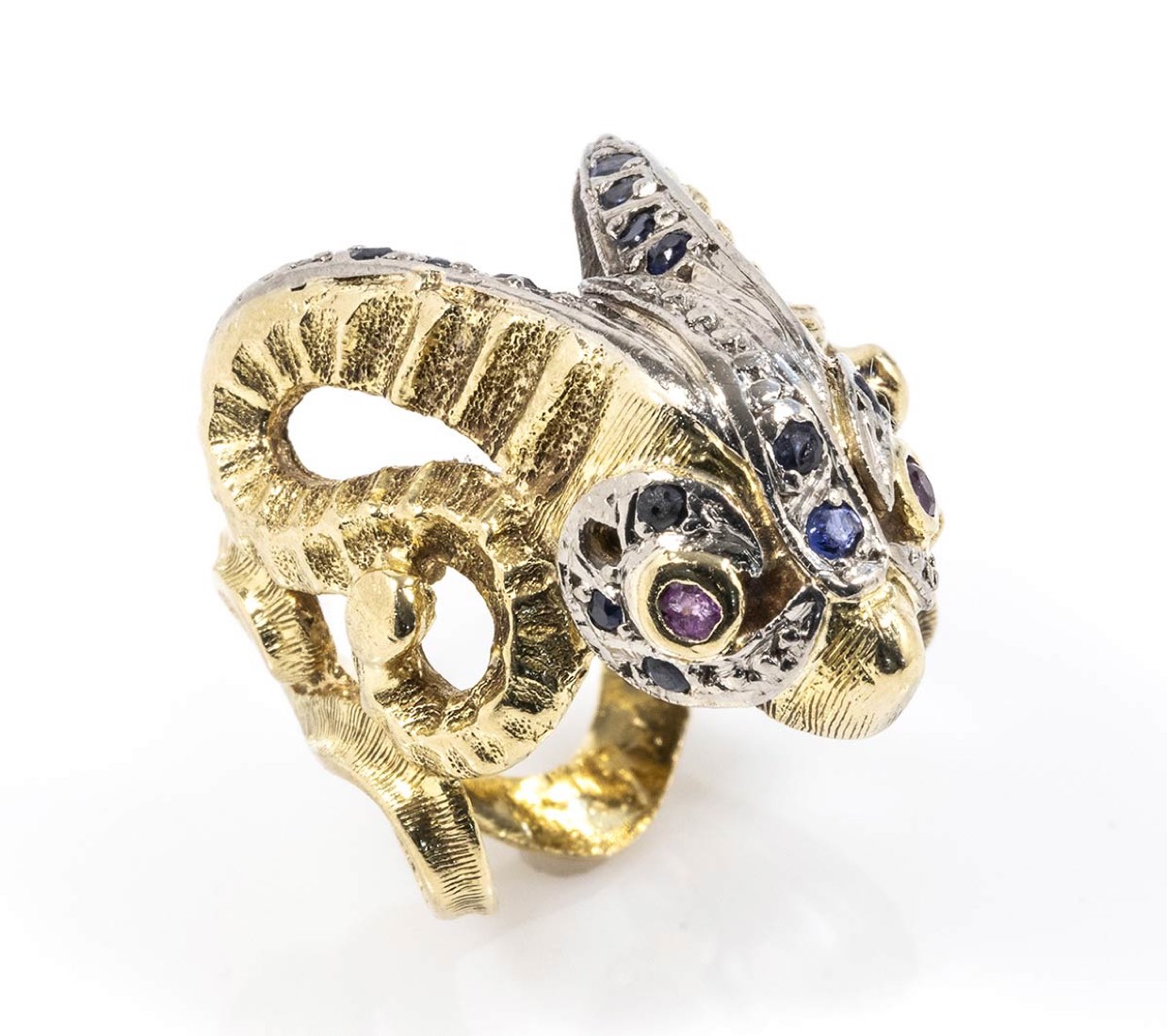 oro giallo e bianco con zaffiri e rubini 0,30 ct circa. Anello a forma di ariete realizzato in Italia a mano e finemente cesellato. Dimensioni fronte 23 x 20 mm. Misura IT 9 - Misura US 5. Peso 12,5 gr. Stato di conservazione: ***** eccellente.