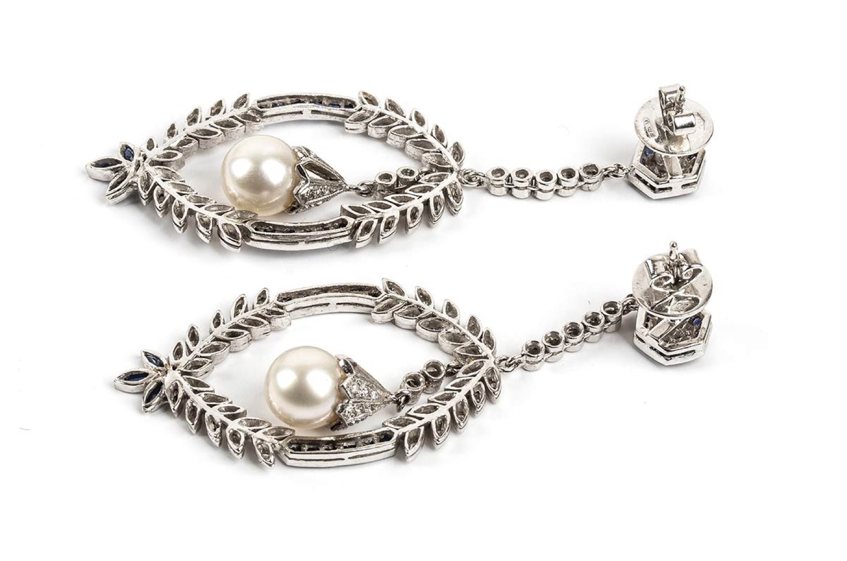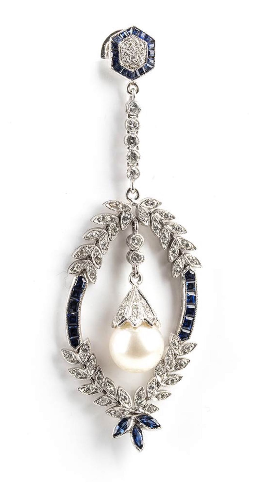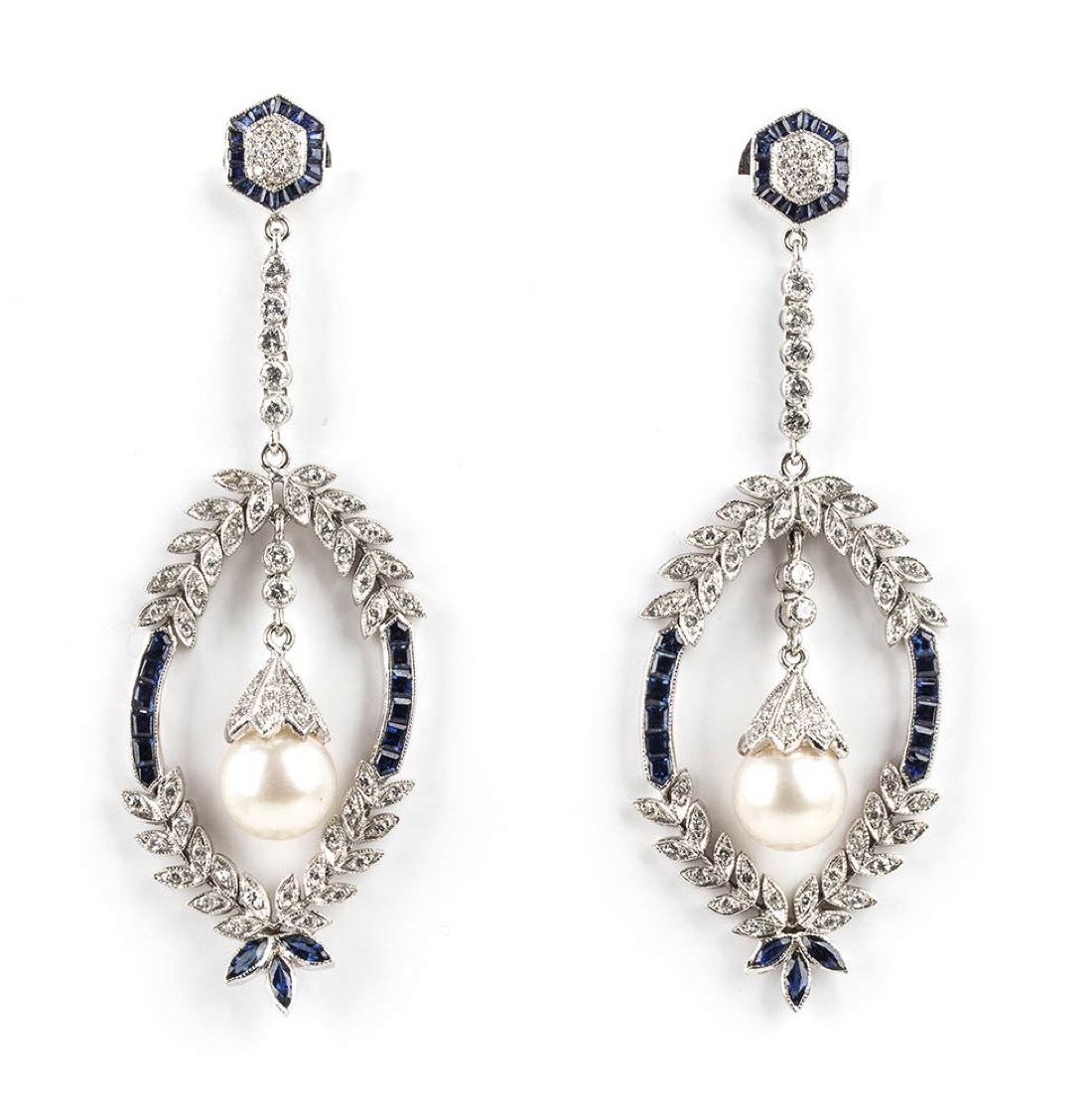 Paio di orecchini pendenti in oro con diamanti, zaffiri e perle