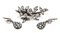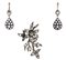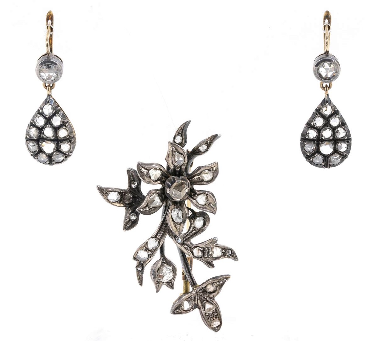 composta da un paio di orecchini ed una spilla con motivo a fiore girevole, in argento 925 e oro 18k, incastonati con diamanti taglio a rosa 1,10 ct circa. Dimensioni spilla 47 x 29 mm. Peso 10,1 gr. Dimensioni fronte orecchini 30 x 12 mm. Peso 5,6 gr. Stato di conservazione: ***** eccellente.