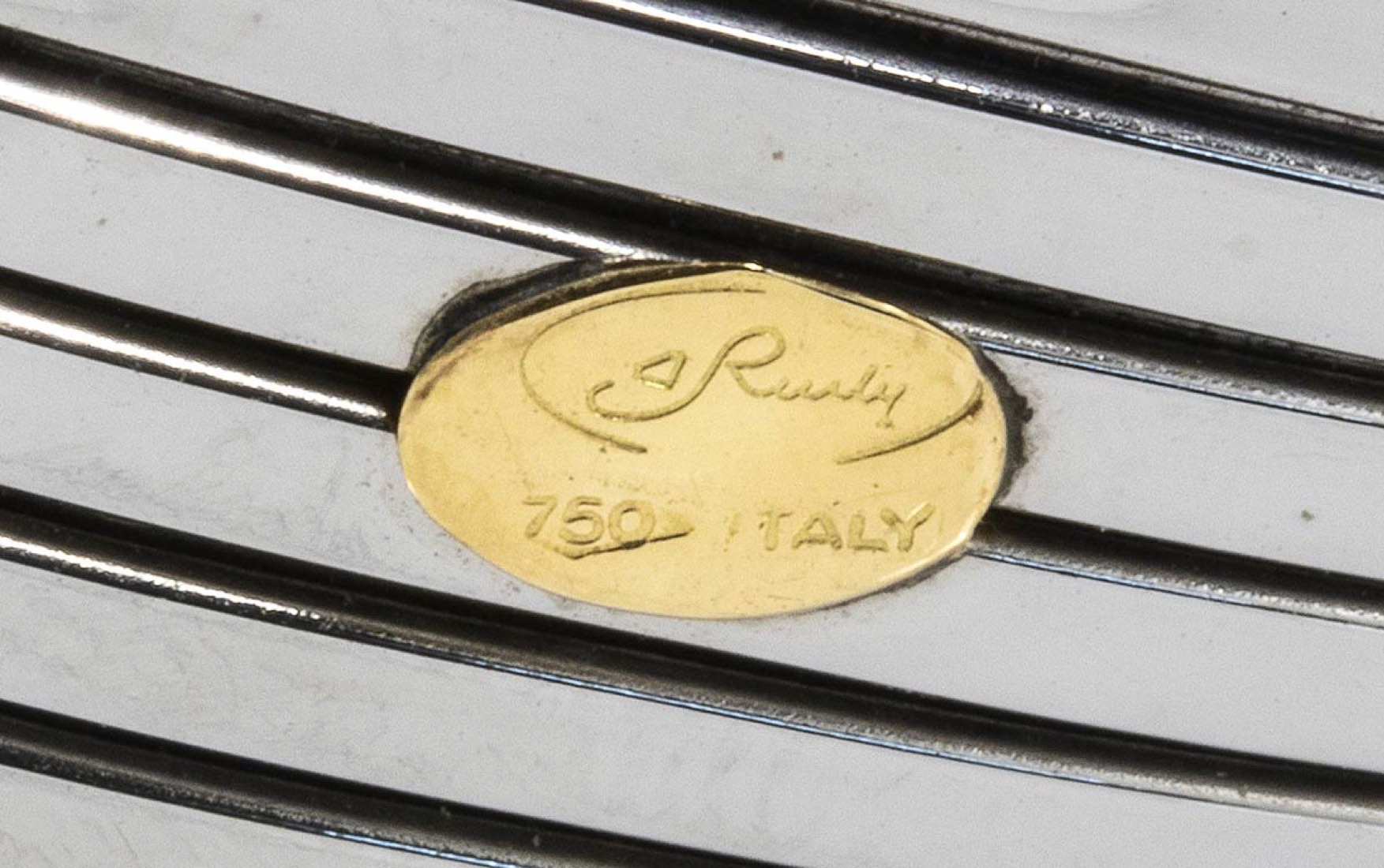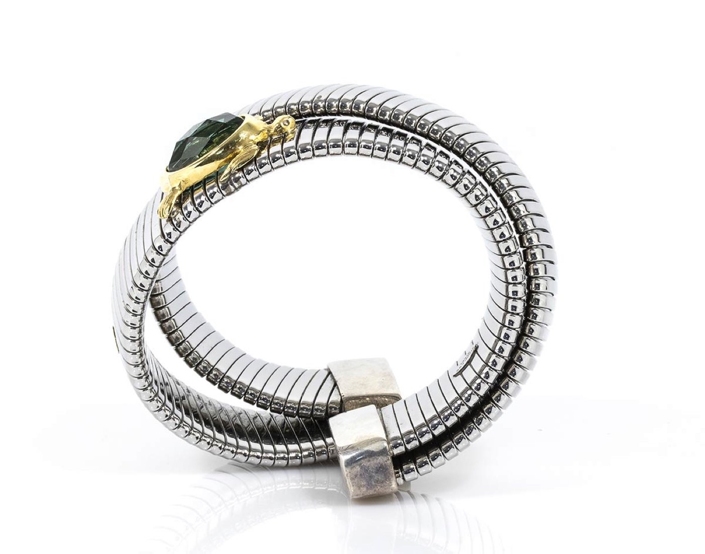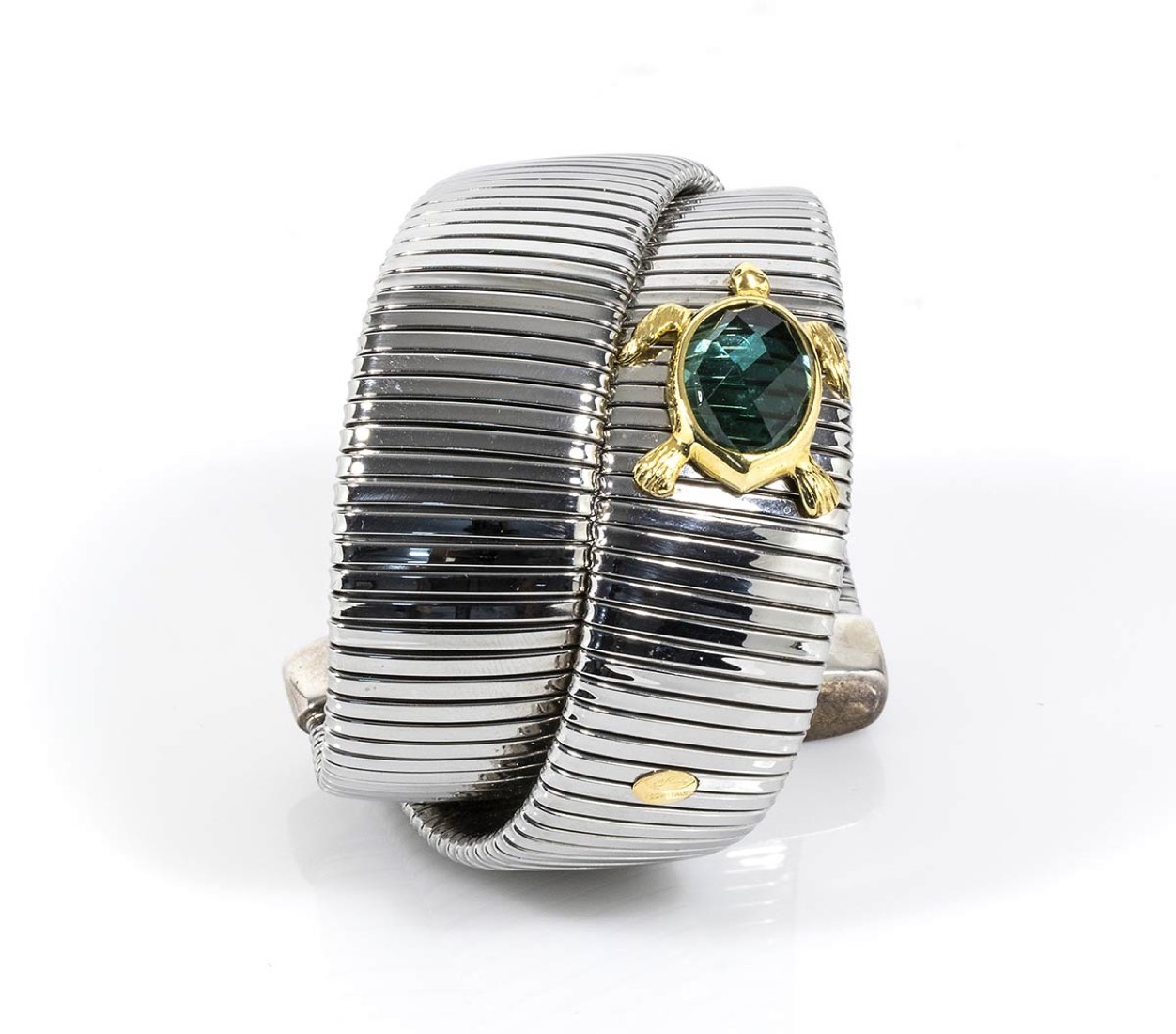 modello tubogas in acciaio con oro giallo 18k e argento 925 con tormalina forma ovale 5,50 ct circa. Dimensioni fronte 65 x 57 mm. Punzonato "750", "Italy" e "RUDY". Peso 85,3 gr. Stato di conservazione: ***** eccellente.