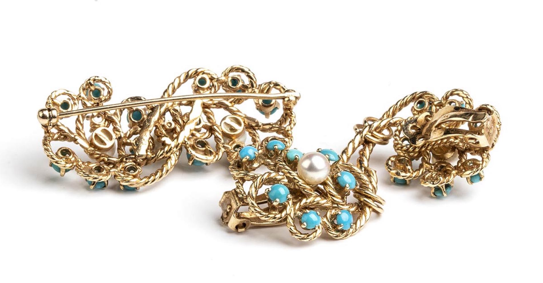 a motivi vegetali in oro giallo 14k, con perle coltivate d'accqua salata punteggiature in cabochon di turchese. Punzonati "14k". Dimensioni spilla 4 x 2 cm. Dimensioni orecchini 3 x 2 cm. Peso 18,4 gr. Stato conservazione: **** buono.