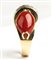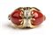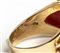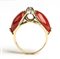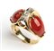 in oro giallo 18k, incastonato con coppia di cabochon di corallo Cerasuolo (Corallium Elatius) separati da linea di diamanti taglio huit-huit, 0,07 ct circa, H, VS-SI. Misure fronte 25 x 15 mm. Misura IT 15 - Misura US 7. Peso 9 gr. Stato conservazione: **** buono.