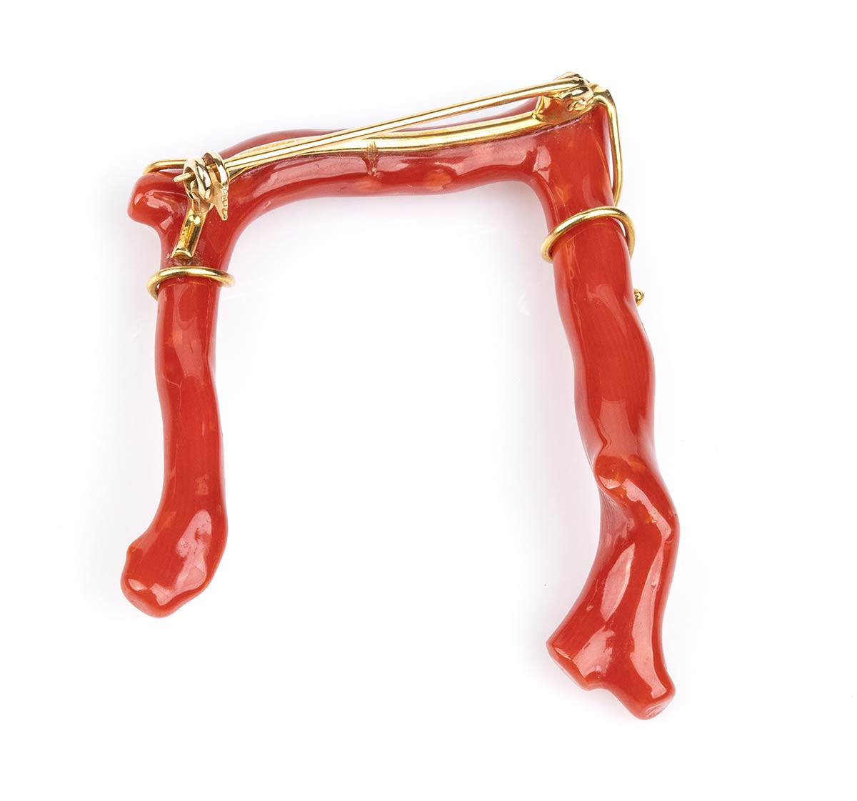 oro giallo 18k, incastonato con piccolo ramo di corallo Mediterraneo (corallium rubrum). Punzonato "750". Dimensioni 50 x 50 mm. Peso 5,9 gr. Stato di conservazione: ***** eccellente.