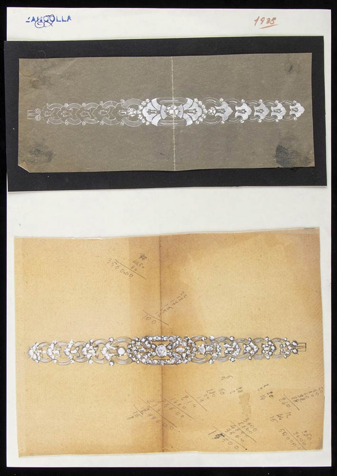 disegni di due bracciali, anni '30. Tecniche miste su velina applicata su cartoncino. Dimensioni cartoncini 20,5 x 9,5 cm; 20 x 14 cm. Stato di conservazione: ***** eccellente.