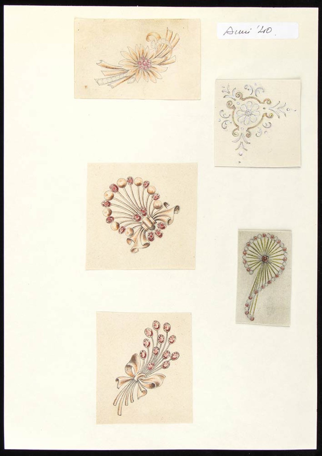 disegni di cinque spille, anni '30. Tecniche miste su carta e velina applicate su cartoncino. Misure massime 7,5 x 6,5 cm. Stato di conservazione: ***** eccellente.