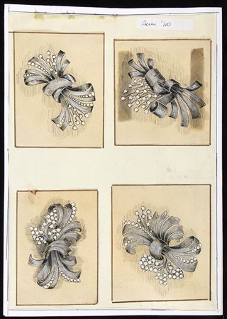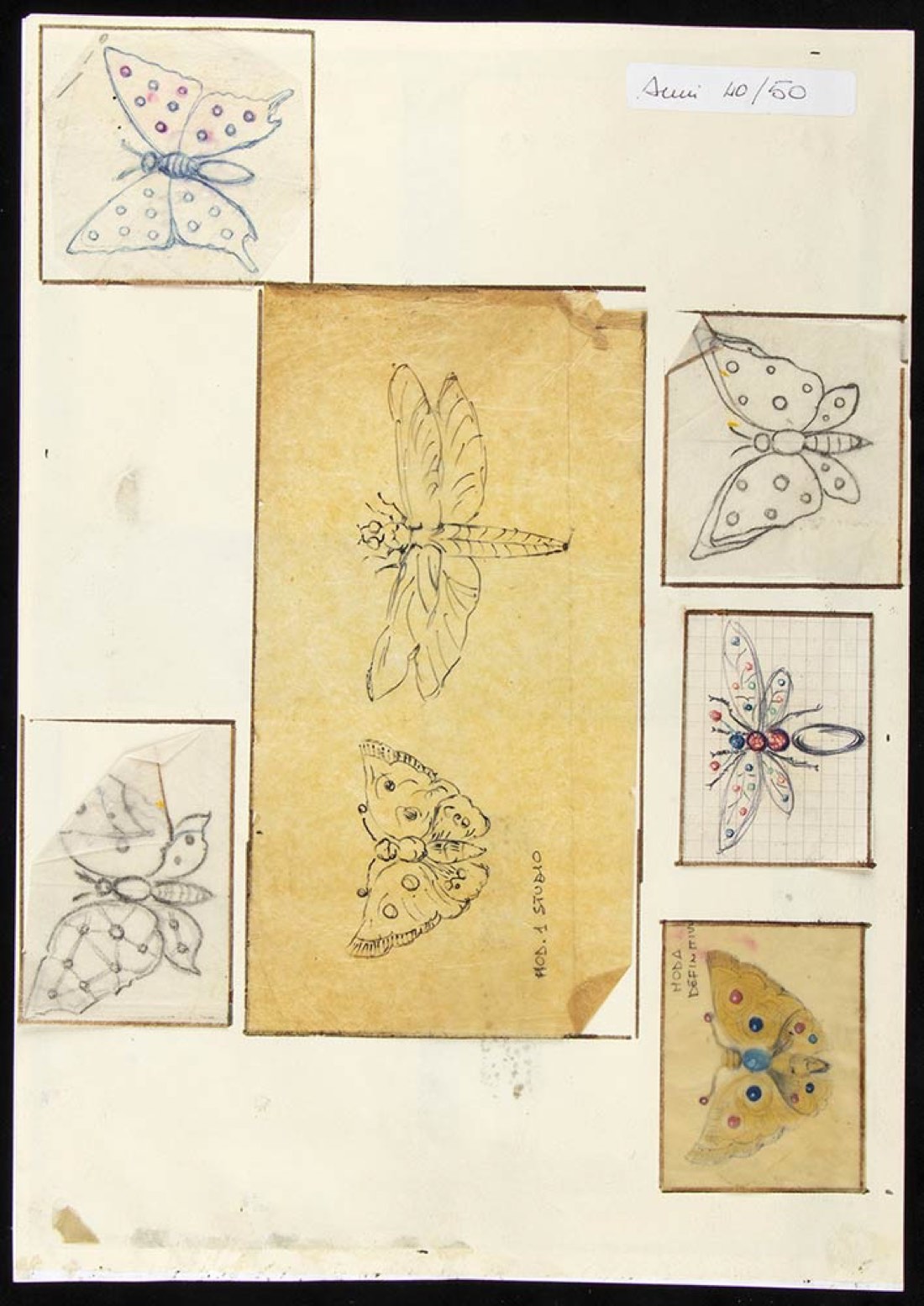 disegno di quattro spille floreali e sette spille ad insetto, anni '40-'50. Tecniche miste su velina applicata su cartoncino. Stato di conservazione: **** buono.