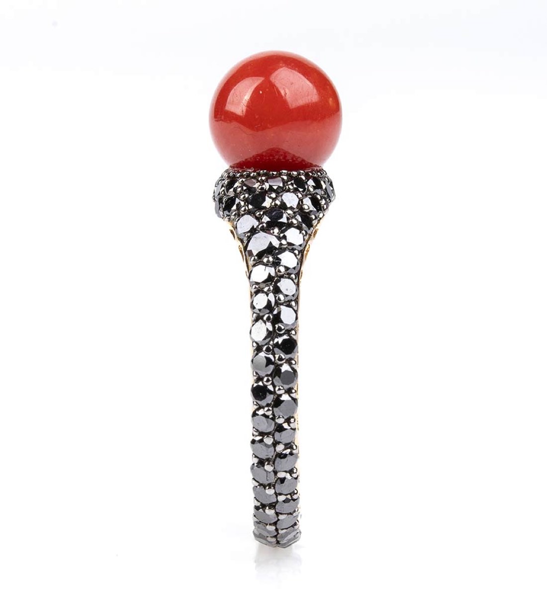 Anello in oro, corallo e diamanti neri