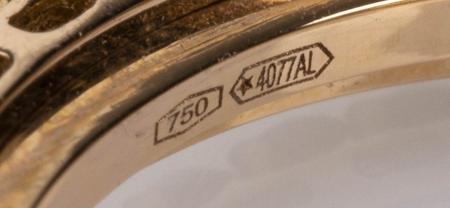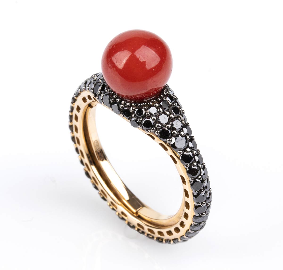 oro rosa 18k, con sfera di corallo Mediterraneo (corallium rubrum) affiancata da pavé di diamanti neri 1,96 ct circa. Punzonato "750", "4077" e "patented". Peso 6,5 gr. Misura IT 16 - Misura US 7,5. Stato di conservazione: ***** eccellente.