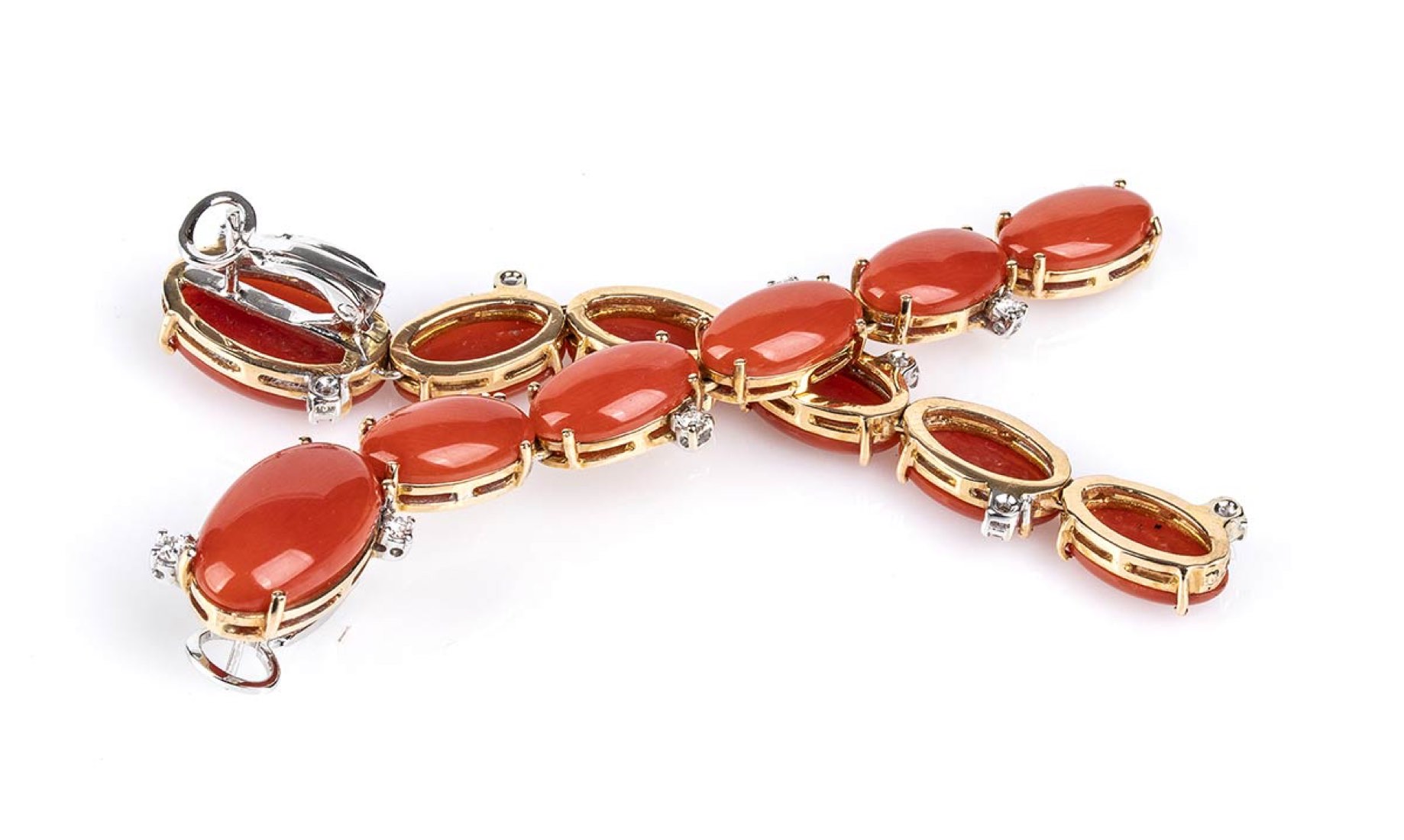 oro giallo 18k, linea di cabochon di corallo Mediterraneo (corallium rubrum) cotornati da diamanti taglio brillante 0,35 ct circa, G-H, VS. Lunghezza 76 mm. Peso 20,4 gr. Stato di conservazione: ***** eccellente.