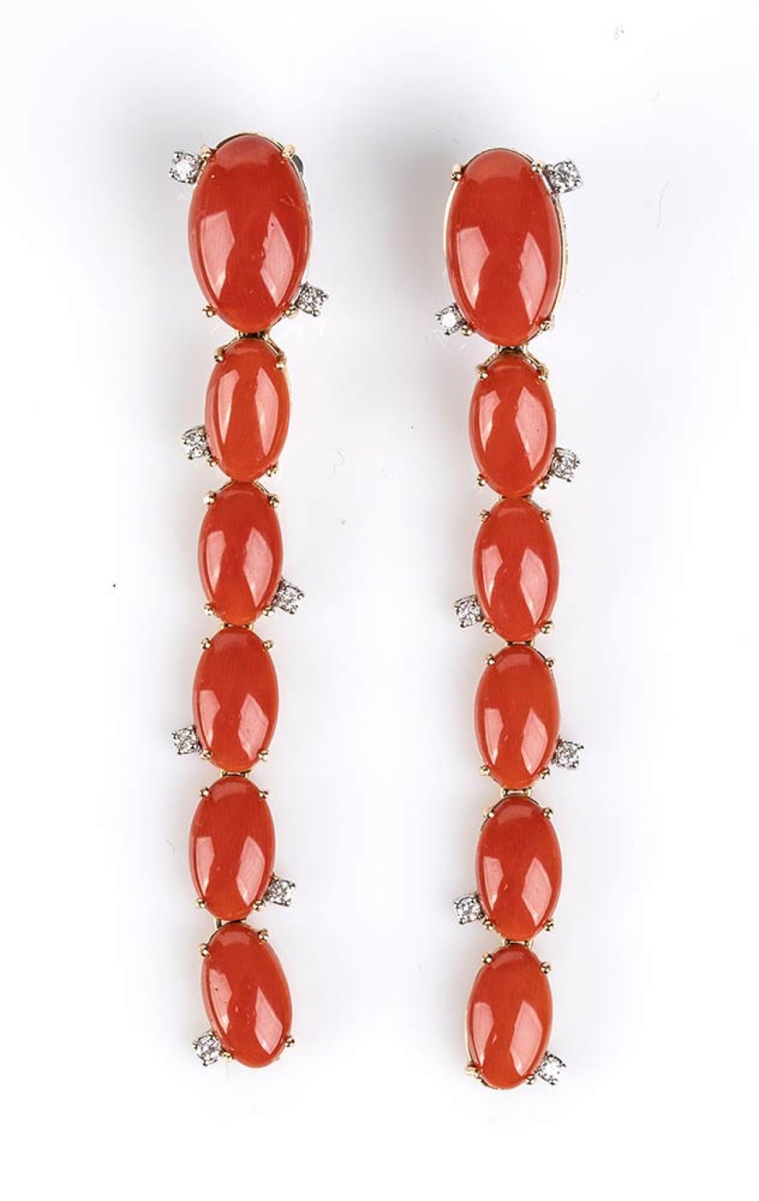 Orecchini pendenti in oro, corallo Mediterraneo e diamanti