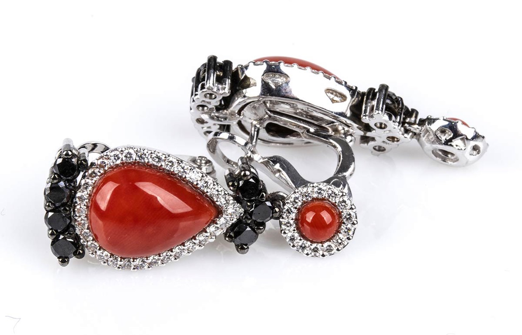 oro bianco 18k, ciascuno incastonato con cabochon di corallo Mediterraneo (corallium rubrum), contornato da diamanti bianchi 0,85 ct circa totali, G, VVS-VS e diamanti neri 1,27 ct circa. Punzonati "750". Dimensioni 30 x 12 mm. Peso 18,5 gr. Stato di conservazione: ***** eccellente.