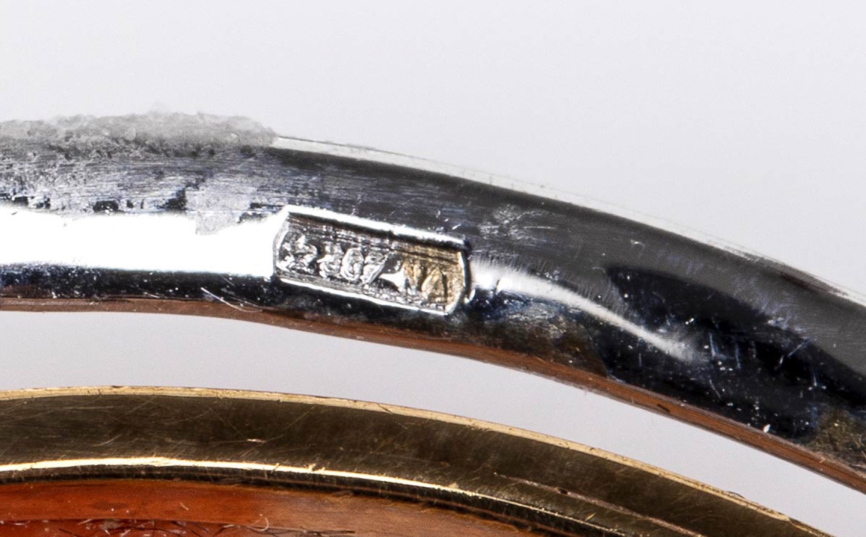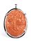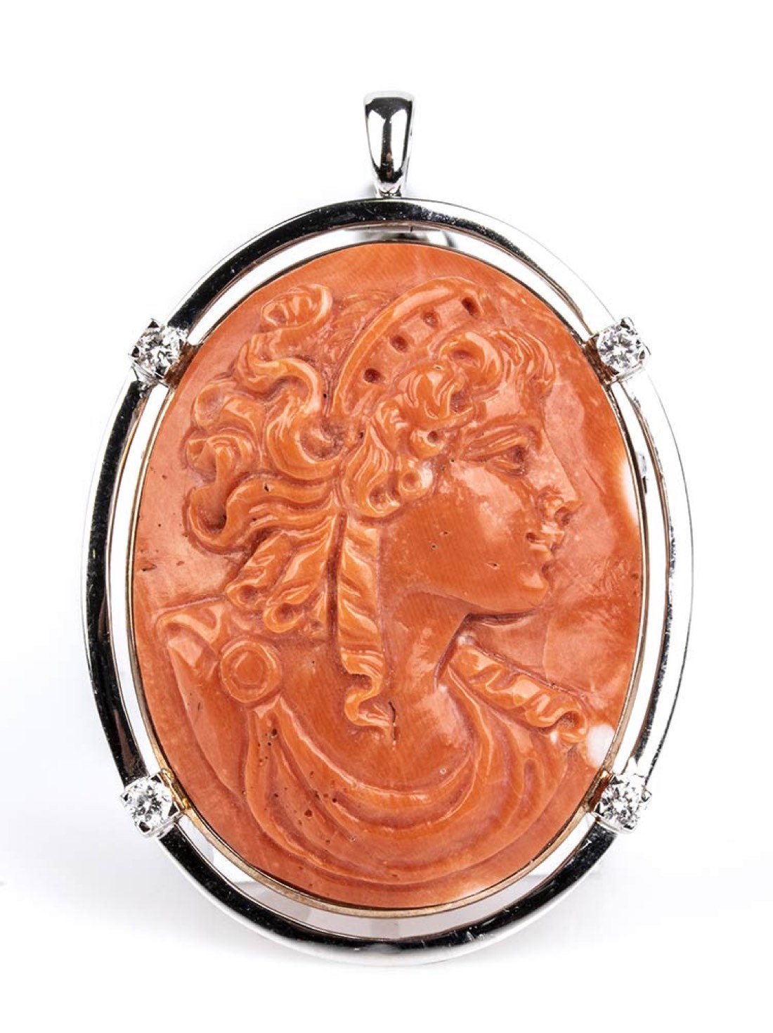 oro bianco 18k, di forma ovale, incastonato con cammeo scolpito in corallo Cerasuolo (corallium elatius) raffigurante un profilo femminile; dettagli in diamanti taglio brillante 0,33 ct circa, G, VVS-VS. Punzonato "750", "307 NA". Dimensioni 52 x 40 mm. Peso 22,2 gr. Stato di conservazione: ***** eccellente.