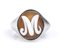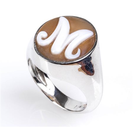oro bianco 18k, incastonato con cammeo scolpito su conchiglia sardonica raffigurante la lettera "M". Punzonato "750" e "307 NA". Dimensioni fronte 20 x 15 mm. Peso 6,2 gr. Stato di conservazione: ***** eccellente.