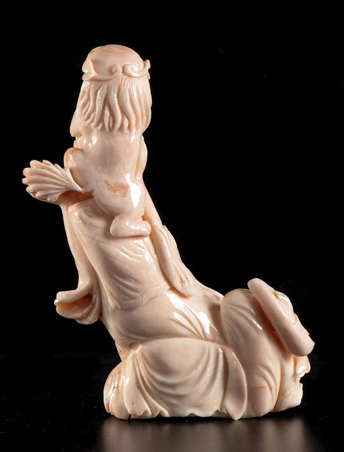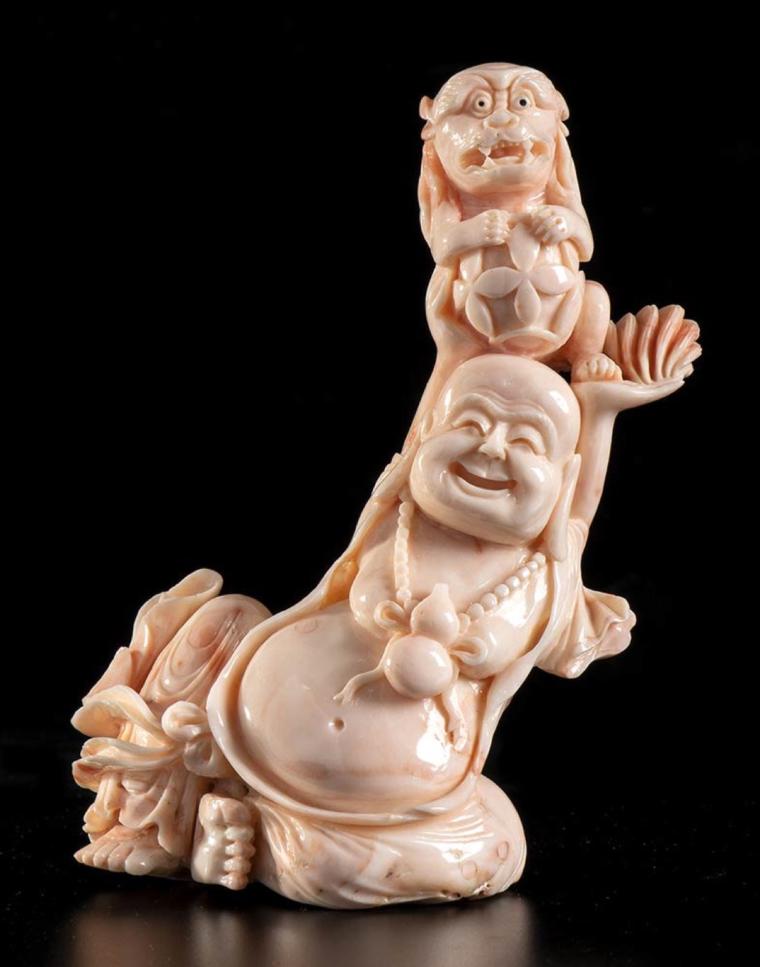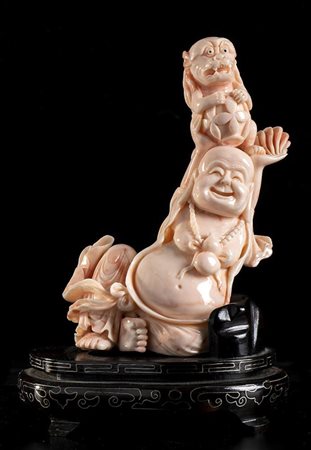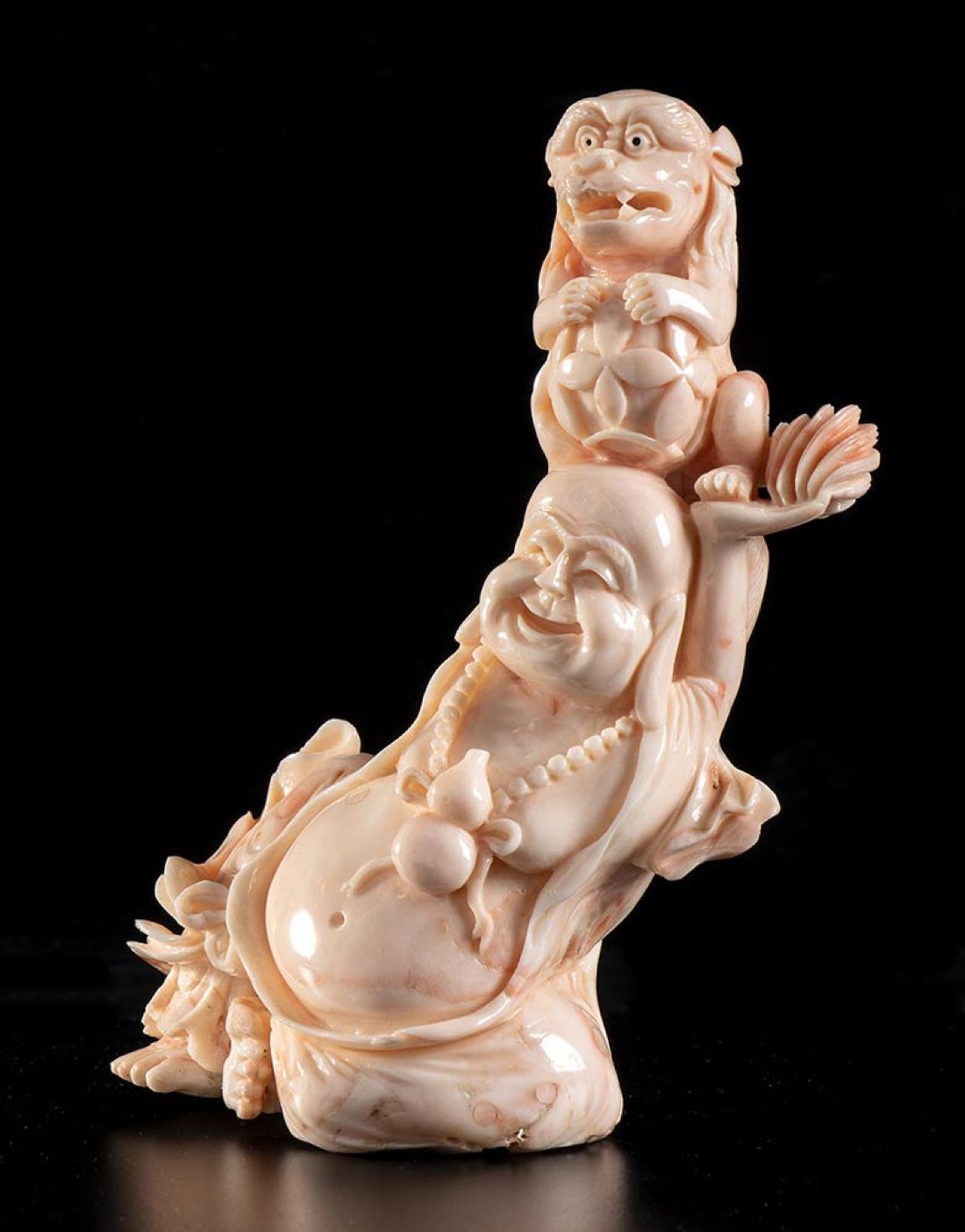(corallium elatius) raffigurante un Buddha sorridente con un cane di Pho posti su una base lignea. Dimensioni scultura 14,6 x 8 x 4,4 cm, base 3,1 x 12 x 7,5 cm. Peso scultura 429,1 gr. Stato di conservazione: ***** eccellente.