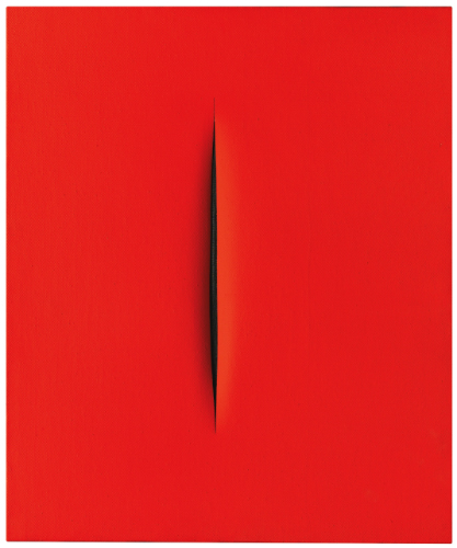 LUCIO FONTANA 1899 - 1968 CONCETTO SPAZIALE, ATTESA signed, titled and inscribed on the reverse, waterpaint on canvas, executed in 1968 firmato, intitolato e iscritto Dieci rintocchi di campana sul retro idropittura su tela cm 55x46 Eseguito nel 1968 PROVENANCE Galleria Stefanoni, Lecco Collezione privata, Rudiano Collezione privata, Palazzolo sull'Oglio Ivi acquistato dall'attuale proprietario EXHIBITED Rodengo Saiano, Abbazia Olivetana, Fondazione Ambrosetti Arte Contemporanea, Lucio Fontana. L'altro spazio, 1999, pag. 46, illustrato a colori e in copertina LETTERATURA E. Crispolti, Lucio Fontana. Catalogue raisonné, Bruxelles 1974, vol. II, pagg. 200-201, illustrato E. Crispolti, Lucio Fontana. Catalogo generale, Milano 1986, vol. II, pag. 688, n. 68 T 60, illustrato In 'Italia Oggi', 9 ottobre 1999, illustrato E. Crispolti, Lucio Fontana. Catalogo ragionato di dipinti, sculture, ambientazioni, Milano 2006, pag. 881, n. 68 T 60, illustrato