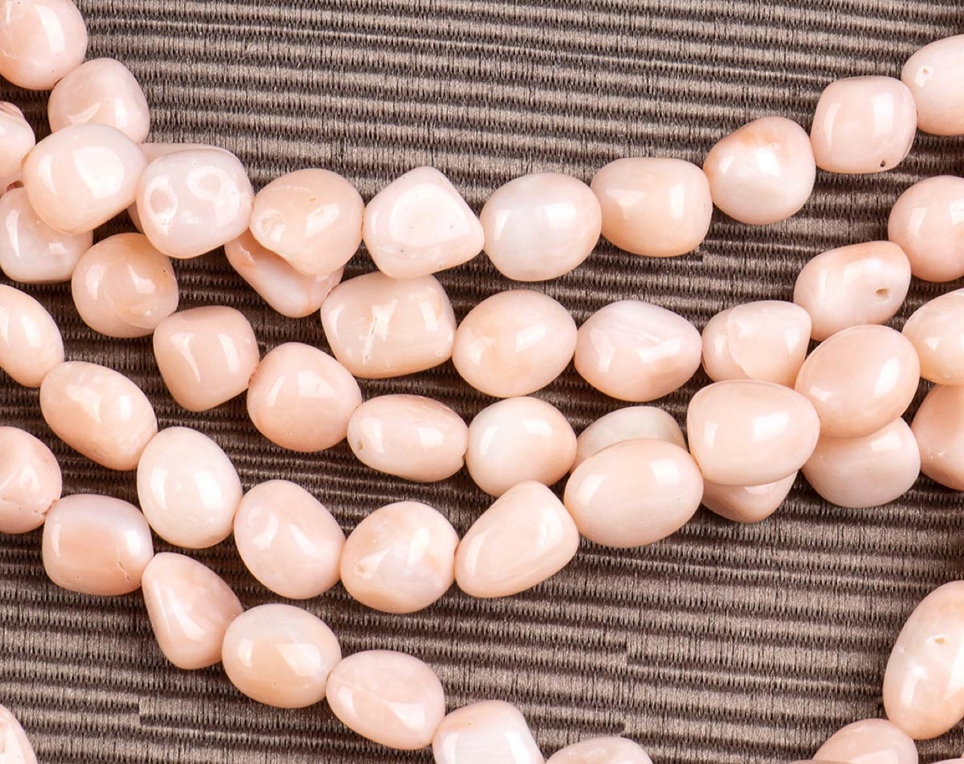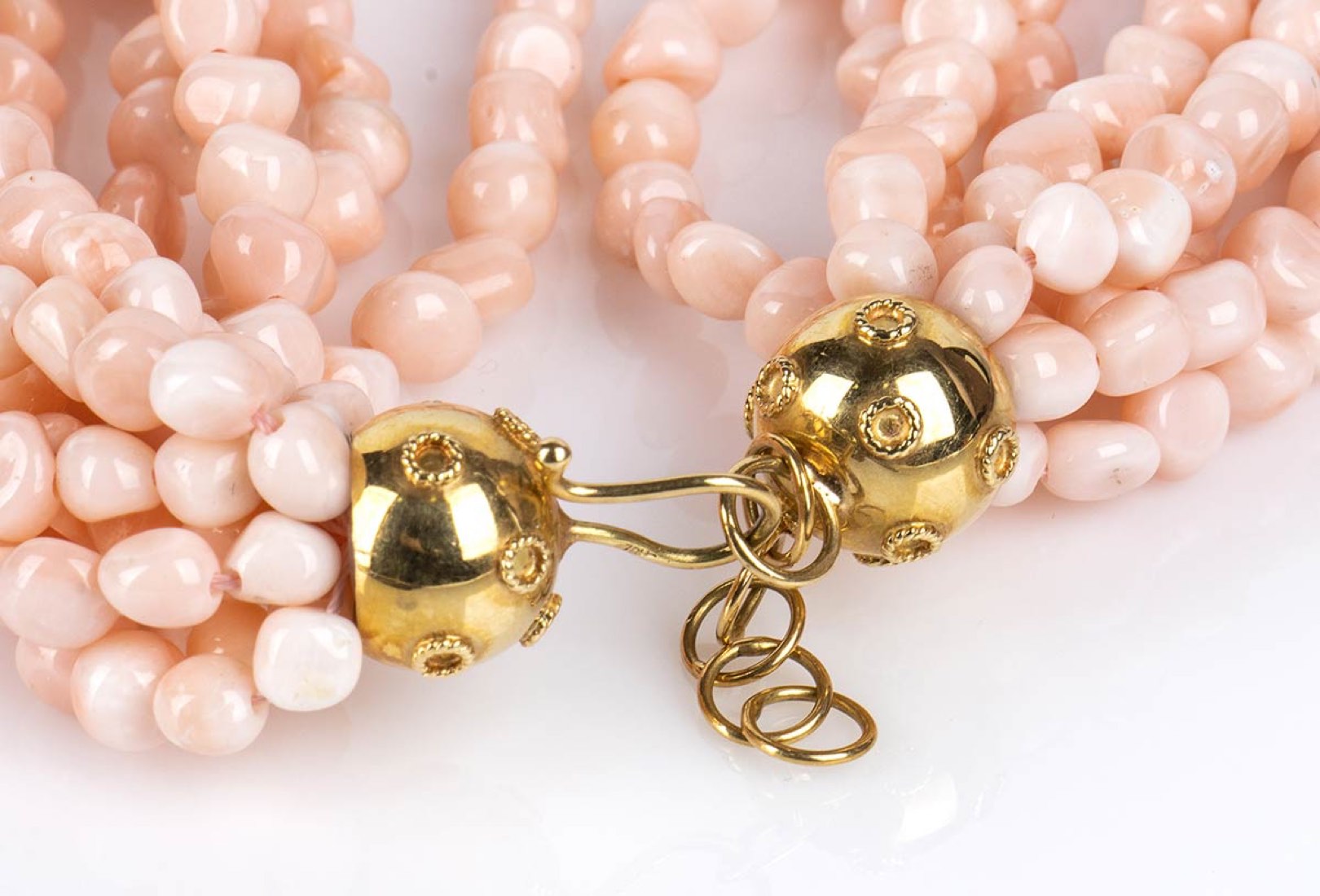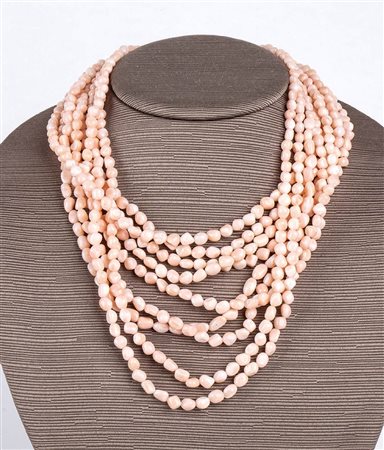 elementi in corallo rosa (corallium secundum). Fermezza in oro 18k. Lunghezza 48 cm. Diametro elementi 4,5-5 mm. Peso 159,6 gr. Punzonato "750". Stato di conservazione: ***** eccellente.