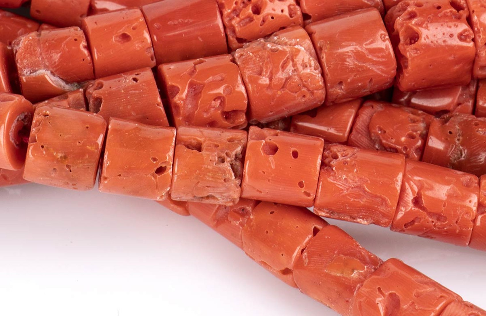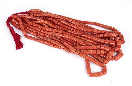 cilindretti di corallo Mediterraneo (corallium rubrum). Lunghezza 65 cm. Dimensioni 13,5-13-10-9 mm. Peso totale 685 gr. Stato di conservazione: ***** eccellente.