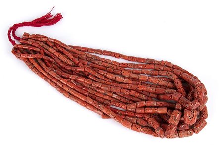 barilotti di corallo Mediterraneo (corallium rubrum). Dimensioni 16-11-7,6 mm. Lunghezza 62 cm. Peso totale 381 gr. Stato di conservazione: ***** eccellente.