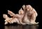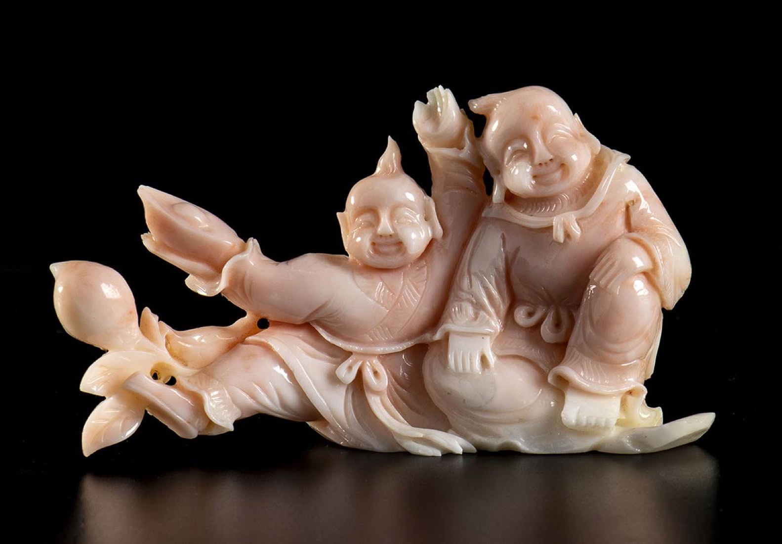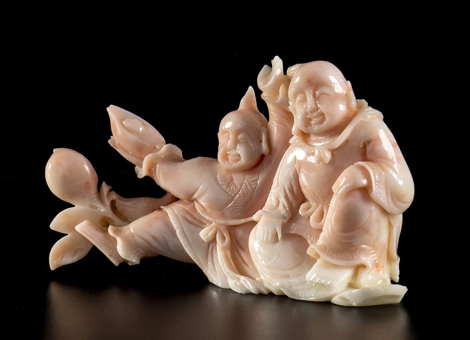 (corallium elatius) raffigurante due personaggi maschili posti su una base lignea. Dimensioni scultura 5,5 x 10,4 x 3 cm, base 3,5 x 12,6 x 6 cm. Peso scultura 106,3 gr. Stato di conservazione: ***** eccellente.