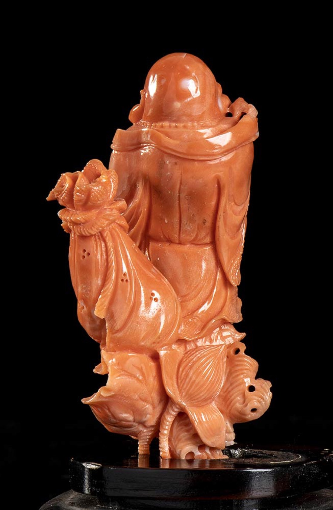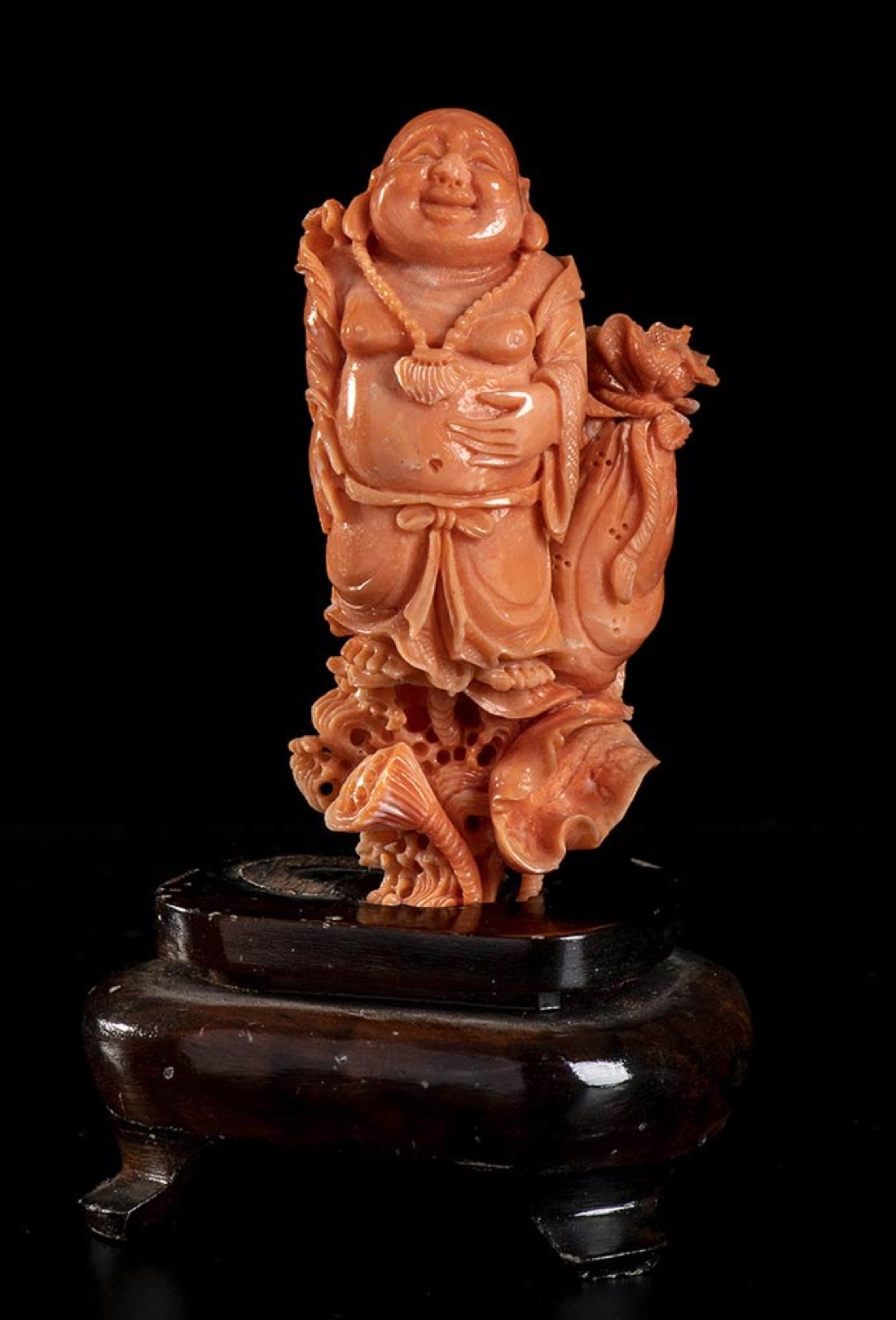 (corallium elatius) raffigurante Hotei, uno dei Sette Saggi della buona fortuna, con il suo sacco, posto su una base lignea. Dimensioni scultura 8,8 x 4,2 x 2,6 cm, base 3,4 x 6,5 x 5,3 cm. Peso scultura 70,2 gr. Stato di conservazione: ***** eccellente.