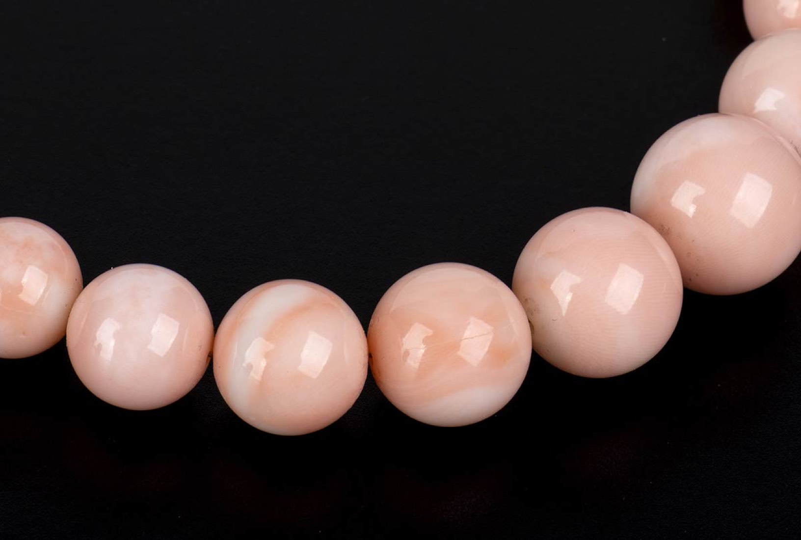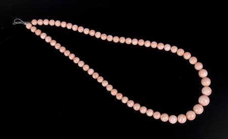 sfere di corallo rosa (corallium secundum) disposte in gradazione. Diametri 13,4-12,4-8,7-8 mm. Lunghezza 58 cm. Peso totale 73,5 gr. Stato di conservazione: ***** eccellente.
