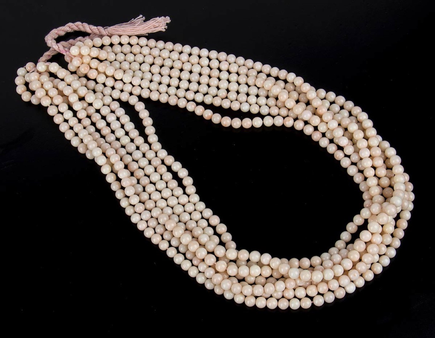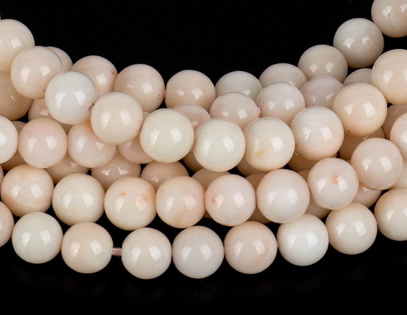 sfere di corallo rosa (corallium secundum) disposte in gradazione. Lunghezza 62 cm. Diametro sfere 7-7,5 mm. Peso 412,9 gr. Stato di conservazione: ***** eccellente.