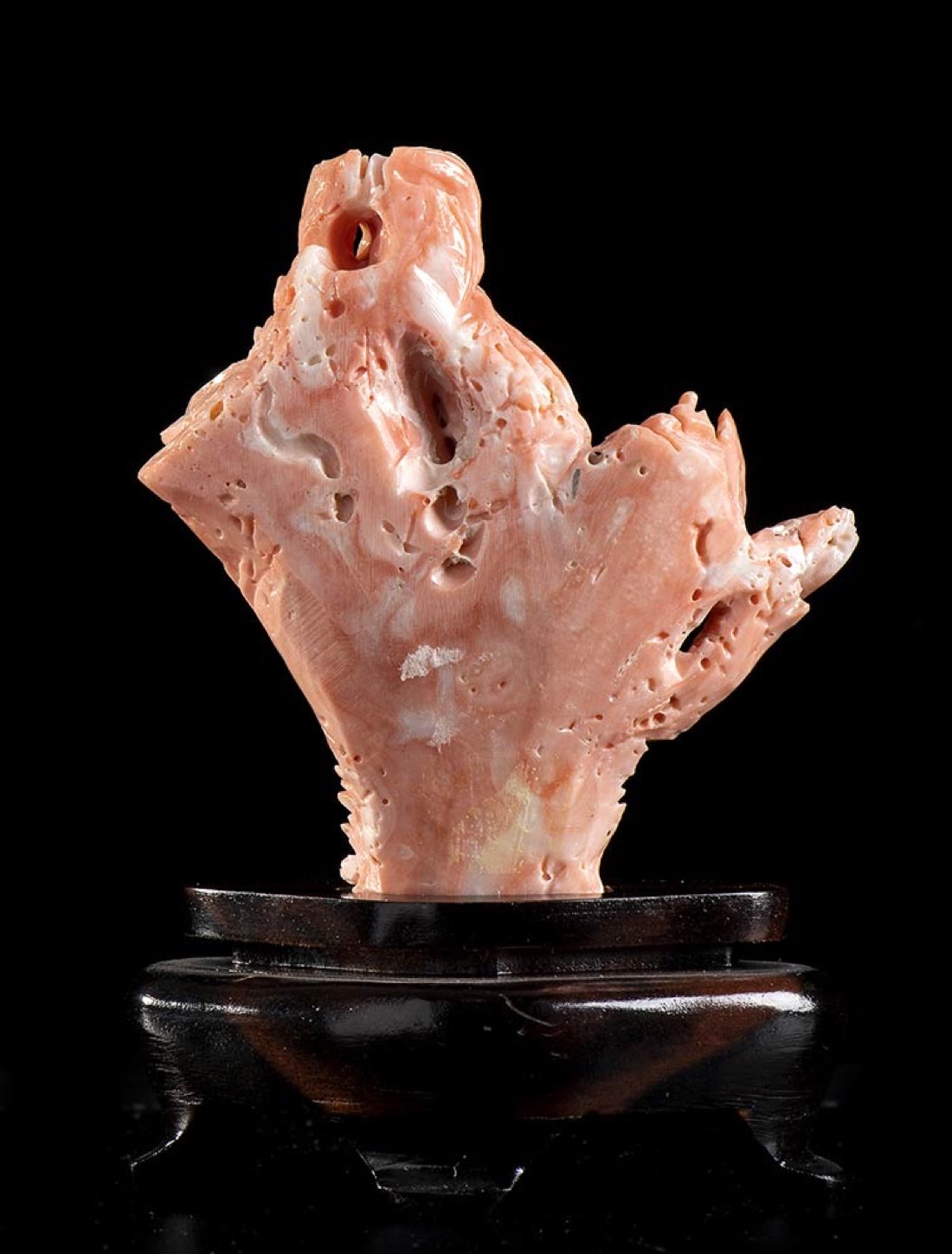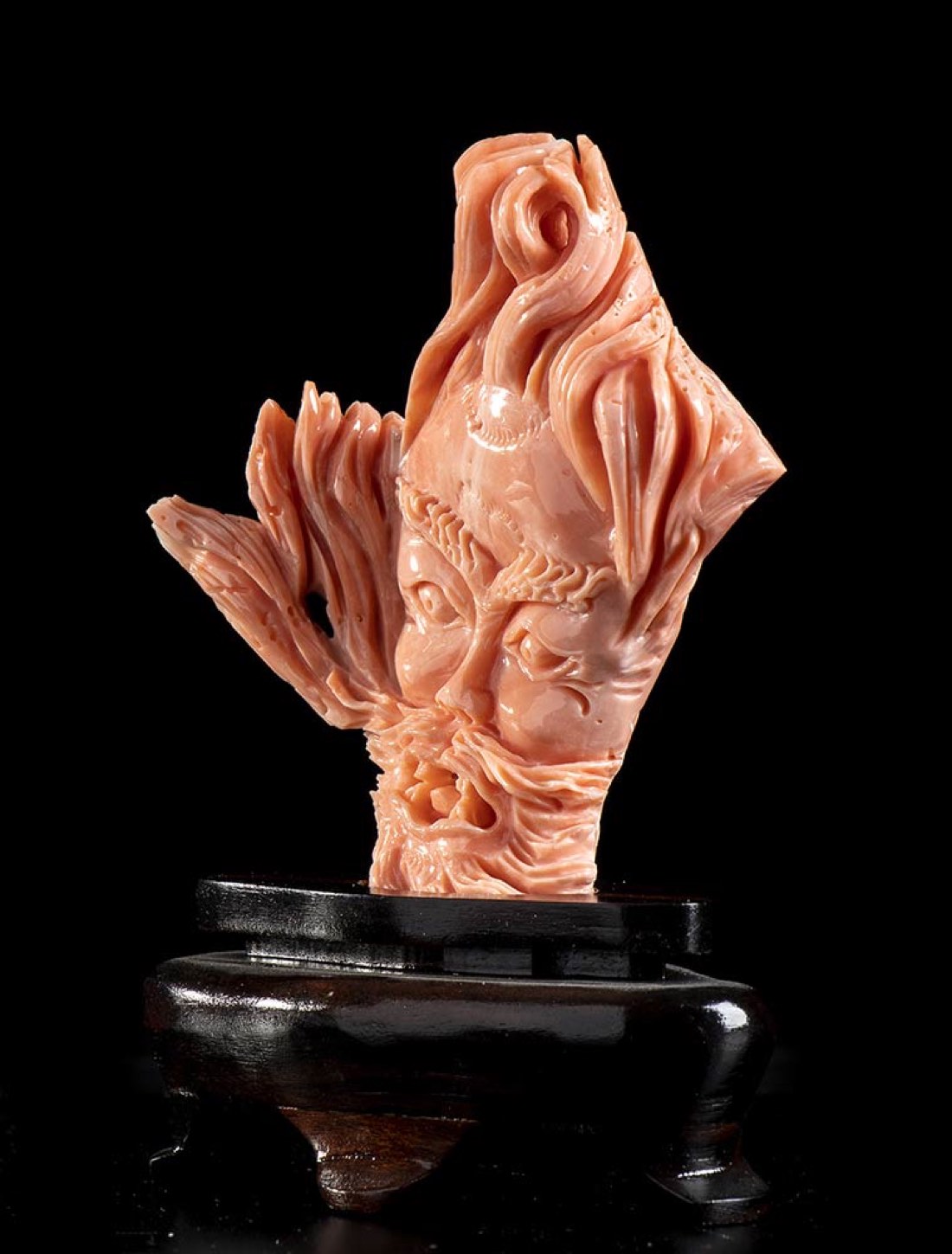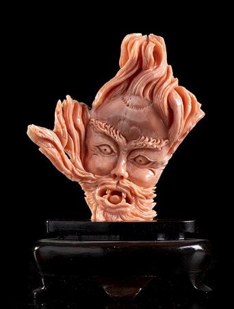 (corallium elatius) raffigurante una maschera posta su una base lignea. Dimensioni scultura 7,8 x 7 x 1,8 cm, base 3 x 7,3 x 4,1 cm. Peso scultura 74,4 gr. Stato di conservazione: ***** eccellente.
