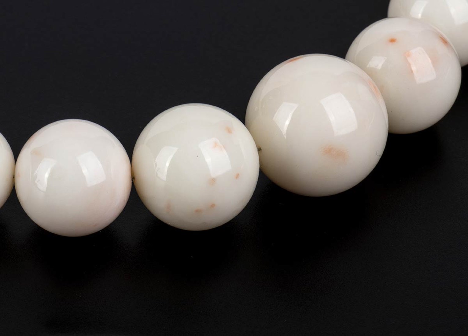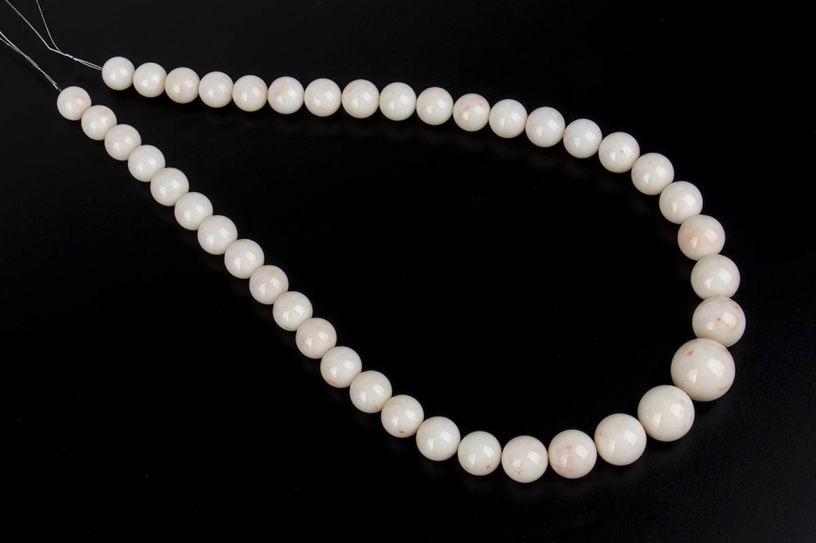 filo di sfere in corallo rosa (corallium secundum) disposte in gradazione. Lunghezza 55 cm. Diametro 20-15-12 mm. Peso 159,6 gr. Stato di conservazione: ***** eccellente.