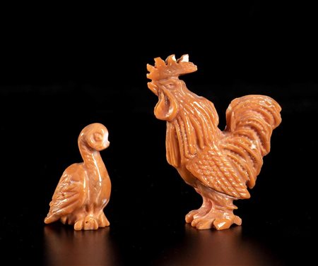 (corallium elatius) raffiguranti un gallo ed un aquilotto. Dimensioni 4,7 x 3,4 x 1,4 cm; 2,9 x 1,5 x 1,4 cm. Pesi 17,5 gr e 7 gr. Stato di conservazione: ***** eccellente.