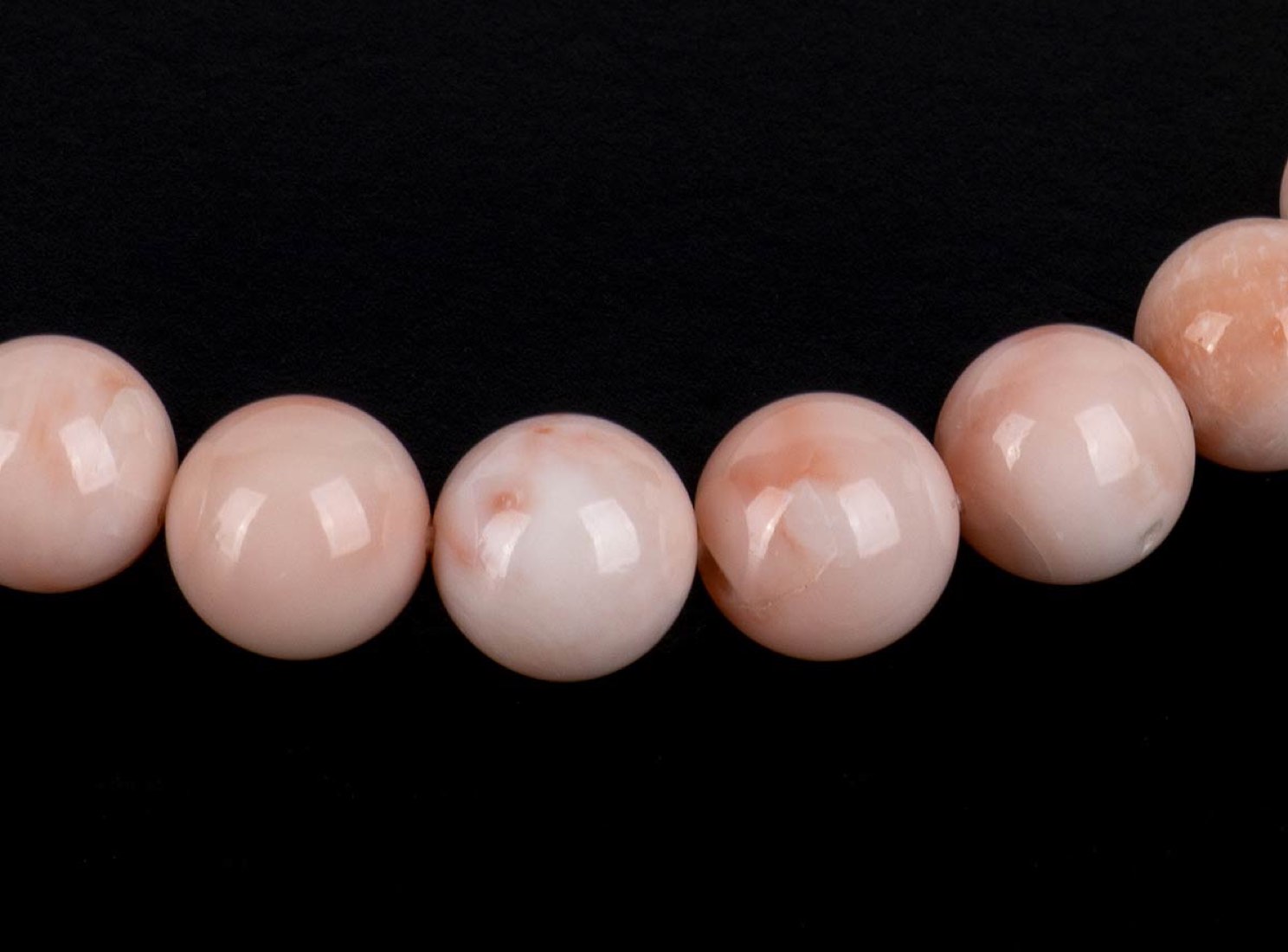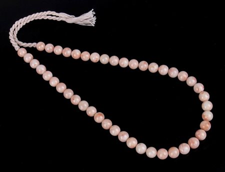 sfere di corallo Midway (corallium sp. nov.) disposte in gradazione. Lunghezza 43 cm. Diametro sfere 10-9,5-9 mm. Peso 56,5 gr. Stato di conservazione: ***** eccellente.