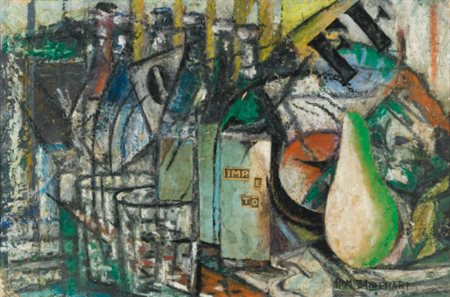 ROBERTO MARCELLO BALDESSARI 1894-1965 NATURA MORTA + TIPOGRAFIA (IMPETO) signed, oil and collage on paperboard laid on cardboard. Executed in 1918 circa firmato olio e collage su cartone compresso applicato su cartoncino cm 23x34,5 Eseguito nel 1918 circa Opera registrata presso l'Archivio Roberto Marcello Baldessari, Rovereto, a cura di Maurizio Scudiero, con il numero B18-38 L’opera è accompagnata da certificato su fotografia rilasciato dall'Archivio Roberto Marcello Baldessari, Rovereto, a cura di Maurizio Scudiero PROVENANCE Galleria Diomedea Arte, Palermo Ivi acquistato dall'attuale proprietario nel 2010 EXHIBITED Firenze, MICRO, Futurismo e futuristi a Firenze, 2011, pag. 16 illustrato