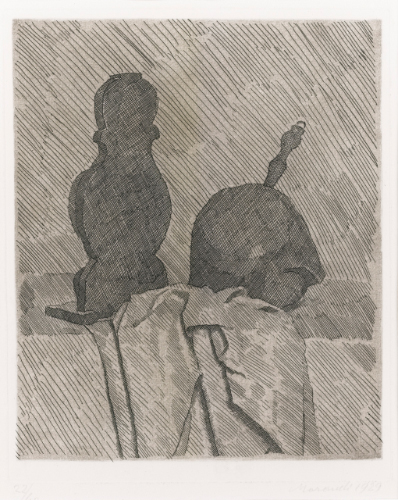 GIORGIO MORANDI 1890 - 1964 NATURA MORTA CON DUE OGGETTI E UN DRAPPO SU UN TAVOLO signed, numbered 22/40 and dated 1929, etching on copper firmato, numerato 22/40 e datato 1929 acquaforte su rame cm 34,5 x 32,5 PROVENANCE Galleria 56, Bologna Ivi acquistato dall'attuale proprietario nel 2010 EXHIBITED Parigi, Musée Maillol; San Paolo del Brasile, MASP, Giorgio Morandi, 1996-1997 LETTERATURA L. Vitali, L'opera grafica di Giorgio Morandi, Torino 1964, n. 64, illustrato