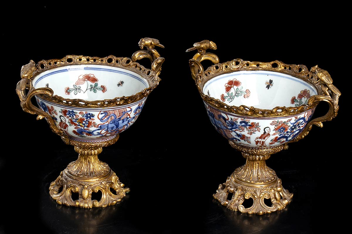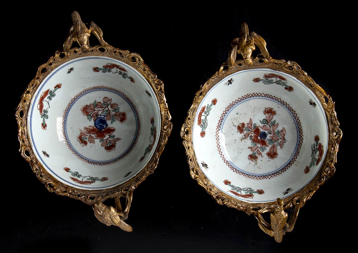 COPPIA DI CIOTOLE IN PORCELLANA DIPINTA CON MONTATURA IN BRONZO DORATO la porcellana Cina, prima metà del XVIII secolo; la decorazione probabilmente Europa, XVIII secolo; la montatura Europa, fine del XIX secolo