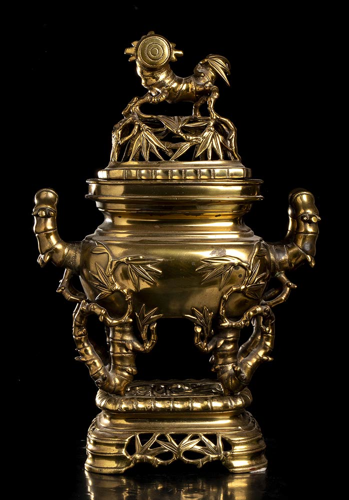 L'incensiere si compone di base, corpo e coperchio, sui quali si svolge una decorazione a tema di fusti e foglie di bambù, il coperchio lavorato a giorno è sormontato da presa modellata ad animale mitologico.