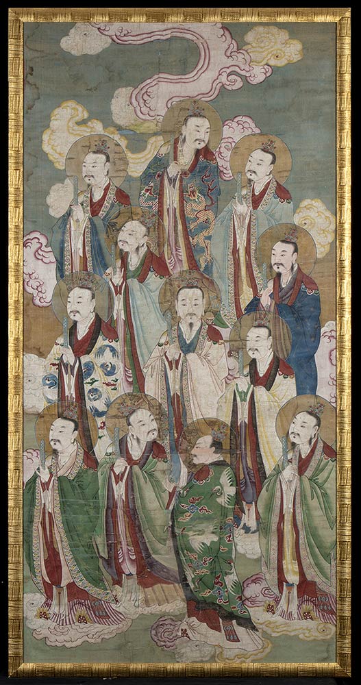 La composizione – dipinta in ricca policromia - raffigura un gruppo di divinità dell'ambito taoista collocate su più registri paralleli orizzontali, ognuna vestita di ampio abito cerimoniale, con le mani giunte al petto a tenere la tavoletta hu e con la testa incorniciata da aureola, per gran parte a rivolgere lo sguardo verso sinistra, cornice in legno e vetro protettivo.